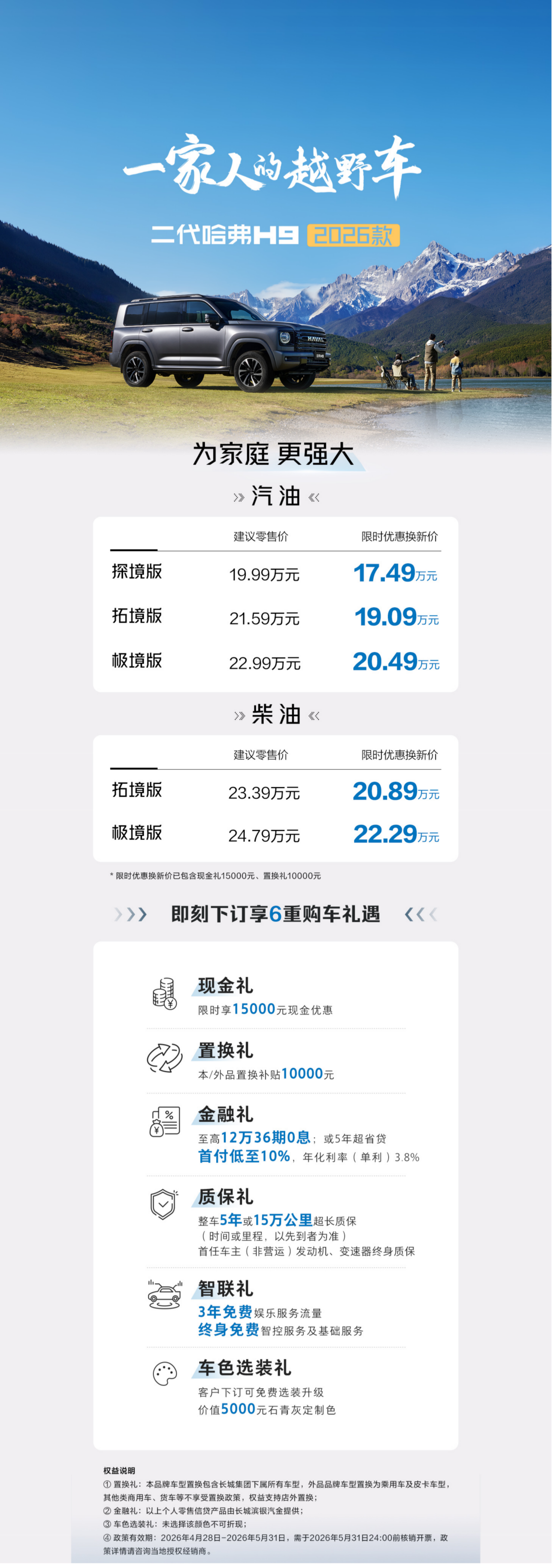 家庭越野首选 二代哈弗 H9 2026 款限时优惠换新价17.49万元起