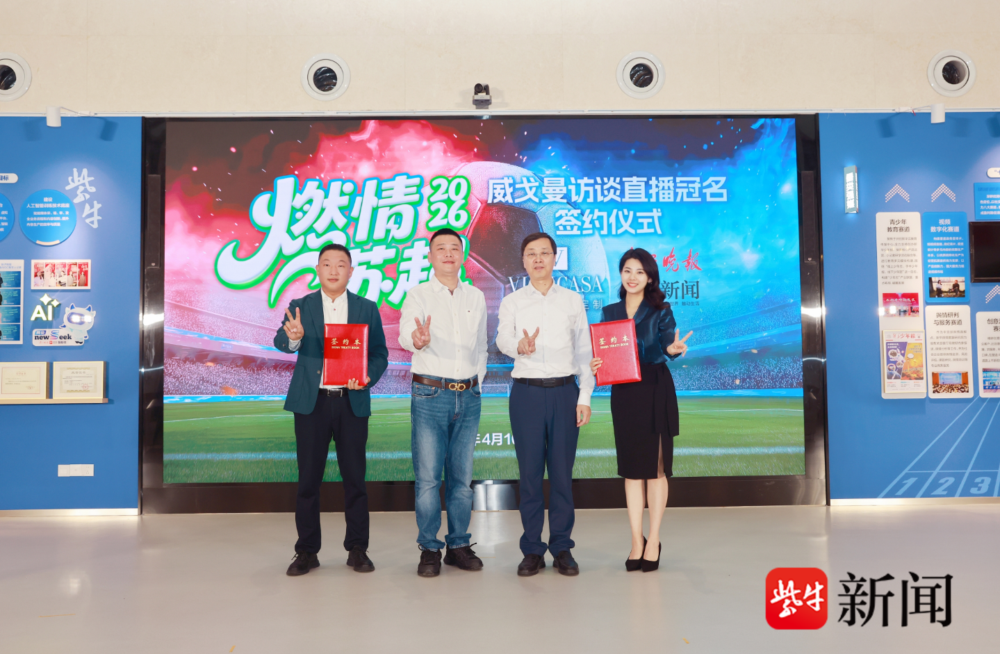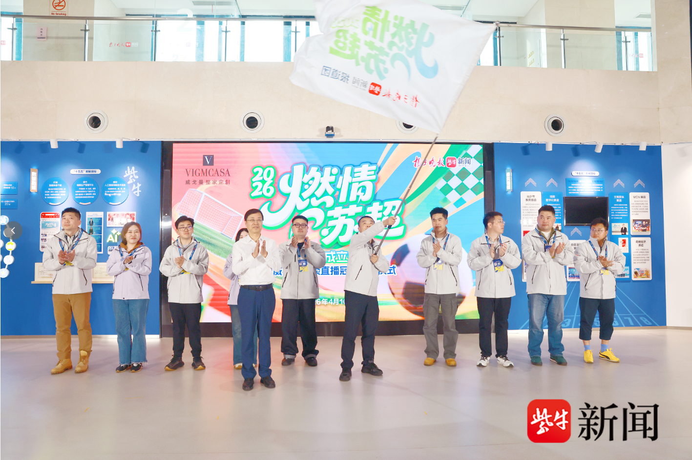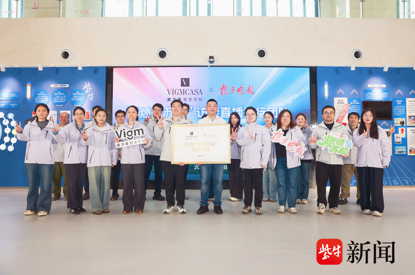 4月10日,2026“燃情苏超”扬子晚报报道团成立仪式暨威戈曼访谈直播冠名签约仪式在扬子晚报融媒大厅举行。新华日报社副总编辑、扬子晚报总编辑刘大颖,威戈曼家居有限公司总经理费清前,扬子晚报副总编辑孙庆等领导嘉宾出席活动。
