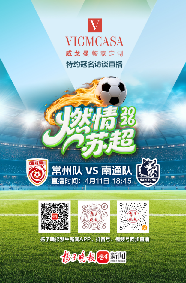 2026赛季江苏省城市足球联赛(“苏超”)将于4月11日正式开赛,扬子晚报视频号、抖音、紫牛新闻客户端三平台将全程直播。首期“燃情苏超2026”威戈曼特约冠名访谈直播将于4月11日18:45在扬子晚报视频号、抖音、紫牛新闻客户端同步开启,与全国球迷共同见证江苏足球热潮。
