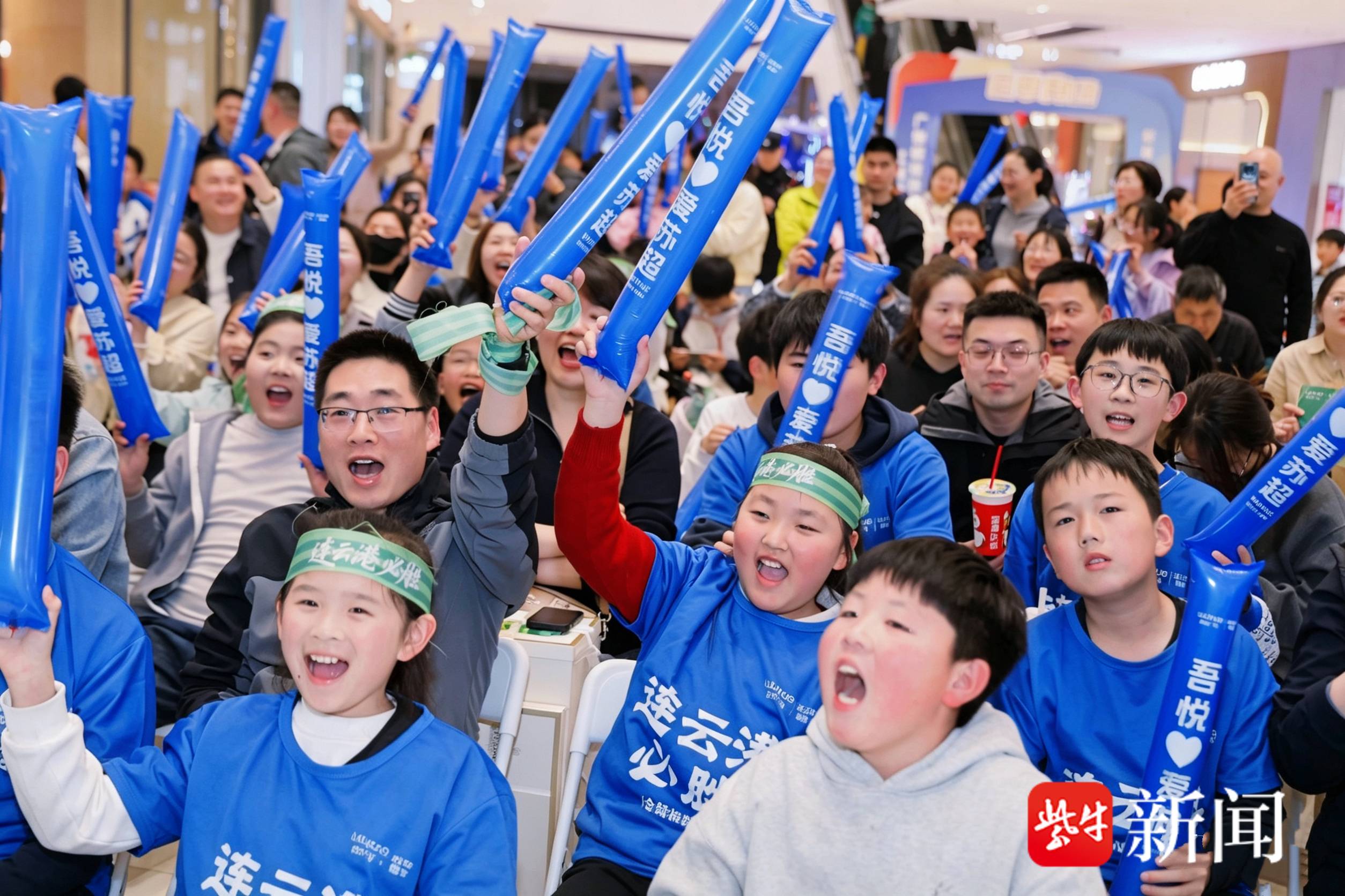 另一边,连云港市赣榆吾悦广场西游厅内同样热度爆棚!作为苏超重要观赛点,商场精心打造沉浸式观赛场景,高清大屏实时直播赛事进程,“吃港城海鲜 争苏超之巅”“来吾悦看球 为苏超加油”的标语随处可见,年轻球迷、学生党们穿着蓝色定制服饰,挥舞着应援道具,呐喊声、欢呼声此起彼伏,将现场气氛推向一个又一个高潮。