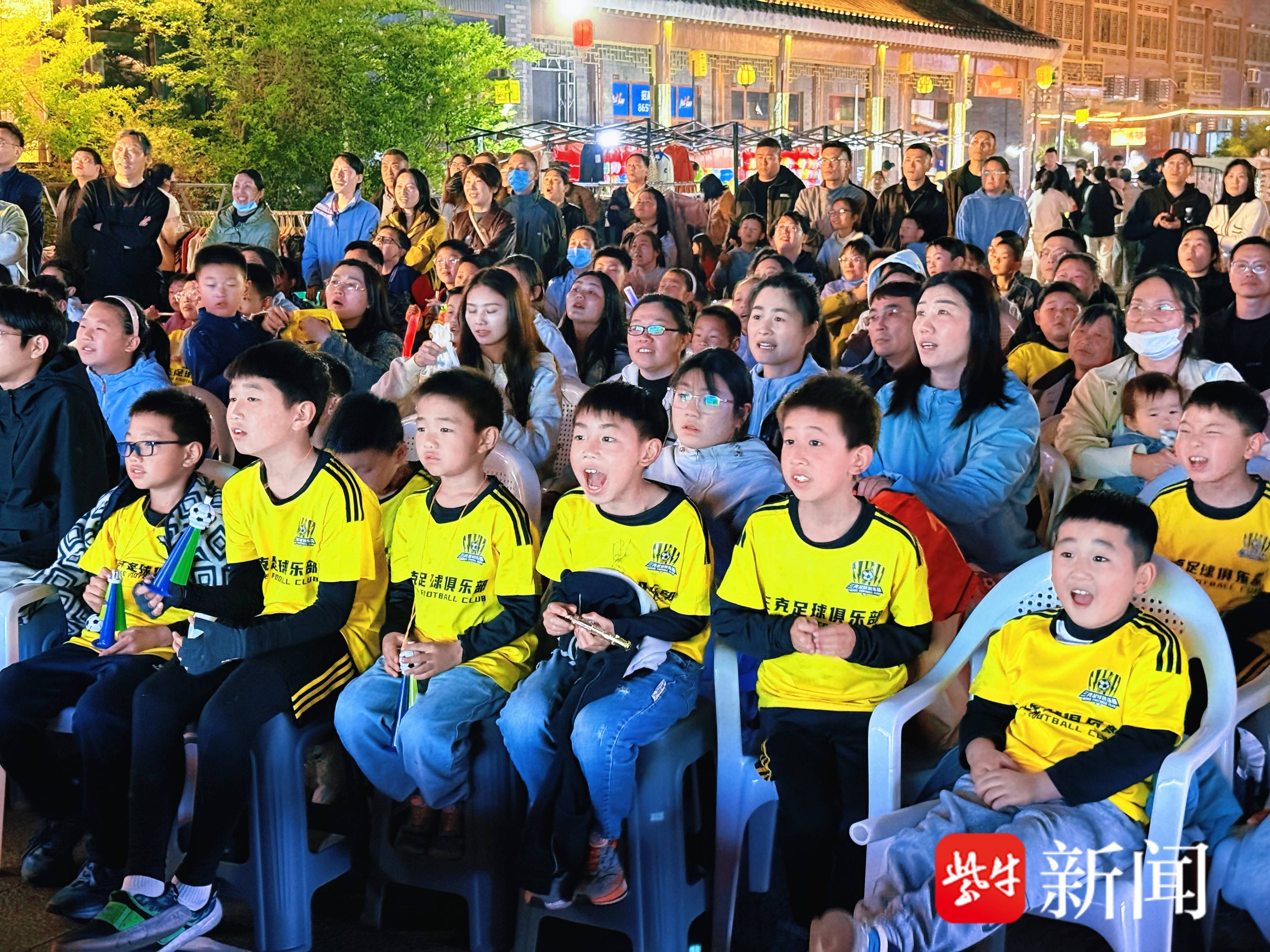 夜幕降临,华灯初上,连云港市赣榆区二道街小南门舞台前早已人头攒动、暖意融融。18时30分,活力满满的预热舞蹈率先登场,瞬间点燃现场气氛,工作人员有条不紊地为市民分发加油棒、小喇叭等应援道具,市民有序就座,或轻声交流球队阵容,或带着孩子了解赛事常识,古老街巷与足球激情碰撞,勾勒出一幅“古韵与活力共生”的动人画卷。