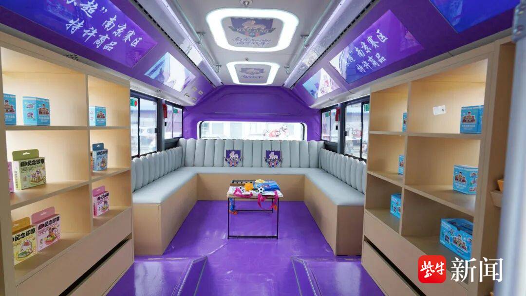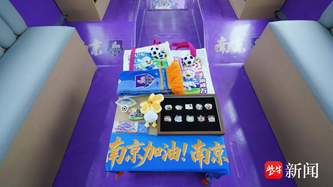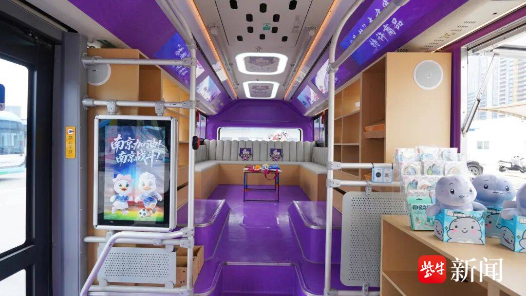 车辆内部设置了“苏超周边补给站”——南京赛区特许商品售卖区,备有主题冰箱贴、明信片、南京特色文旅产品等,让球迷们可以一站式获取赛事纪念品。