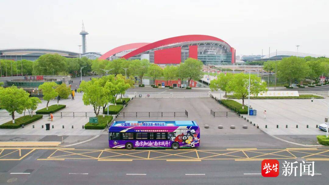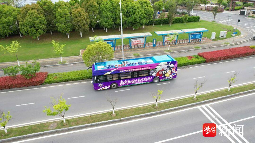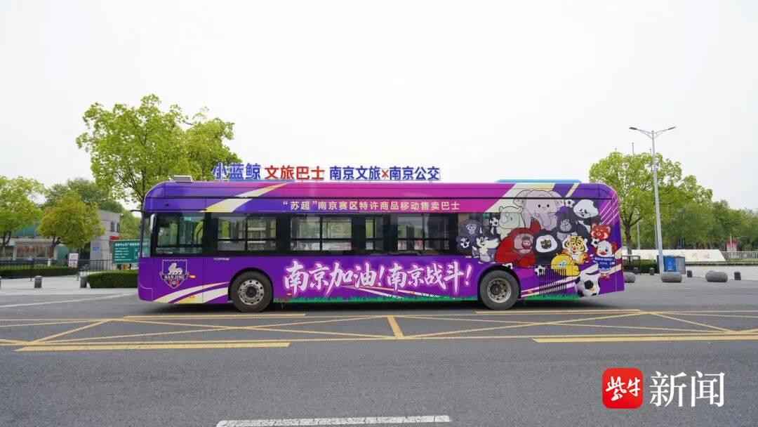 这款巴士由南京文旅与南京公交跨界联动推出,外观设计以南京队队徽亮眼的紫色为主色调,车身巧妙融合了南京公交“小蓝鲸”标识与南京赛区动物球星队元素,整体造型亮眼。