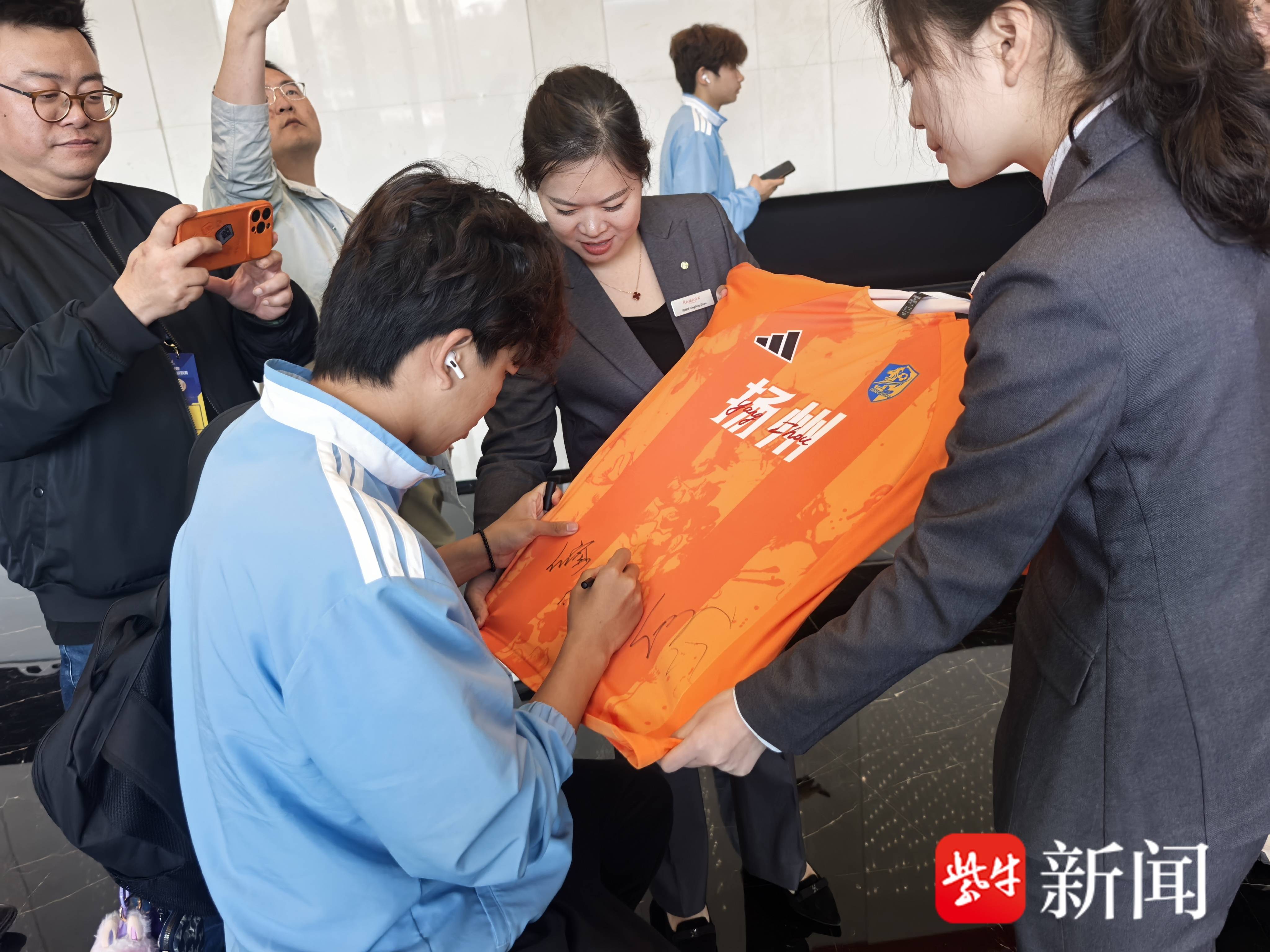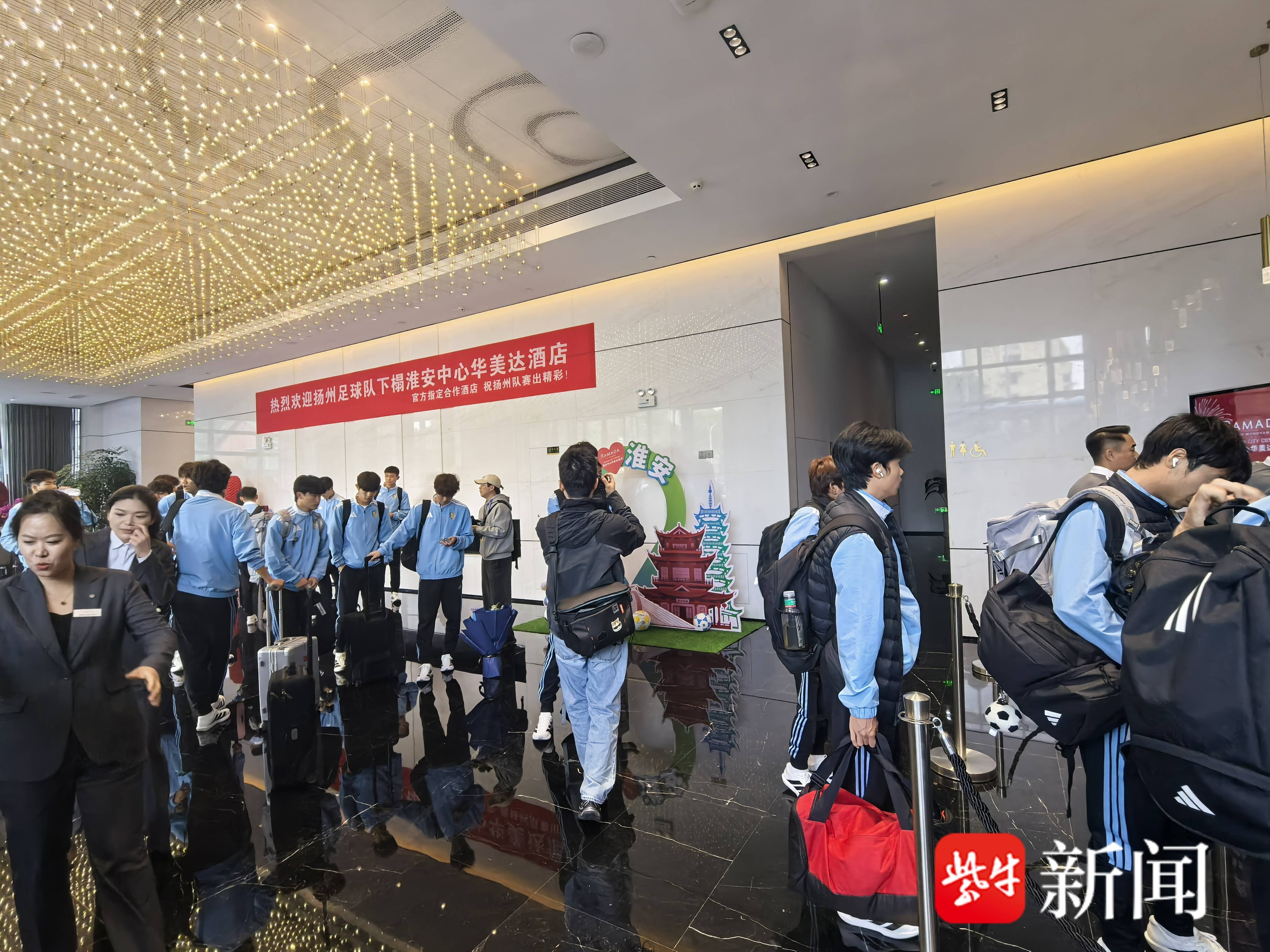 11时30分许,“苏超”扬州队球员乘坐印有“大运雄狮 锐不可当”标语的大巴缓缓进入淮安中心华美达酒店,酒店内外,“苏超”与淮安元素的装饰随处可见。酒店工作人员娴熟地为球员与教练团队办理入住手续,整个过程热情而迅速,展现了淮安专业的接待服务能力,给扬州队留下了深刻印象。