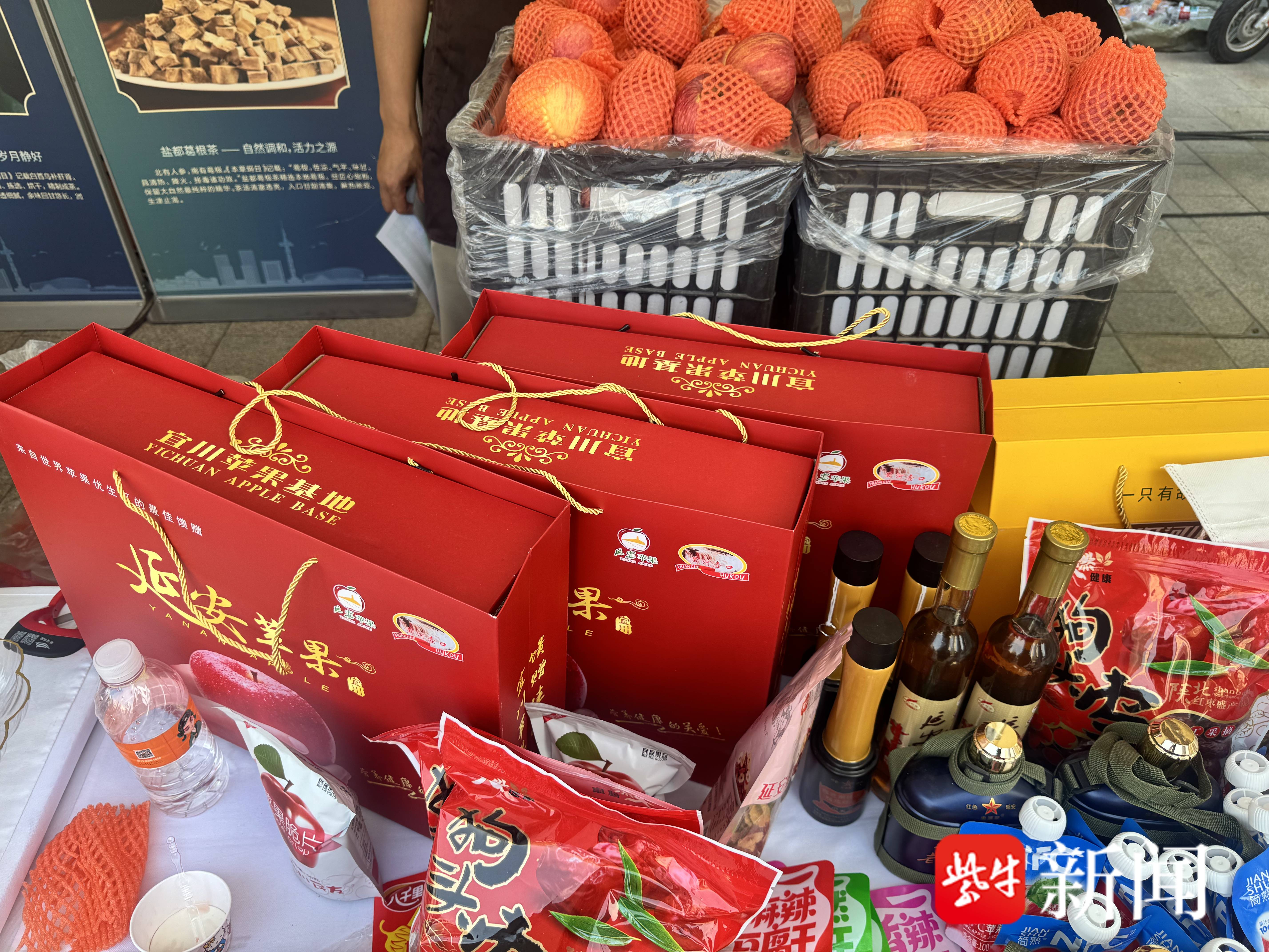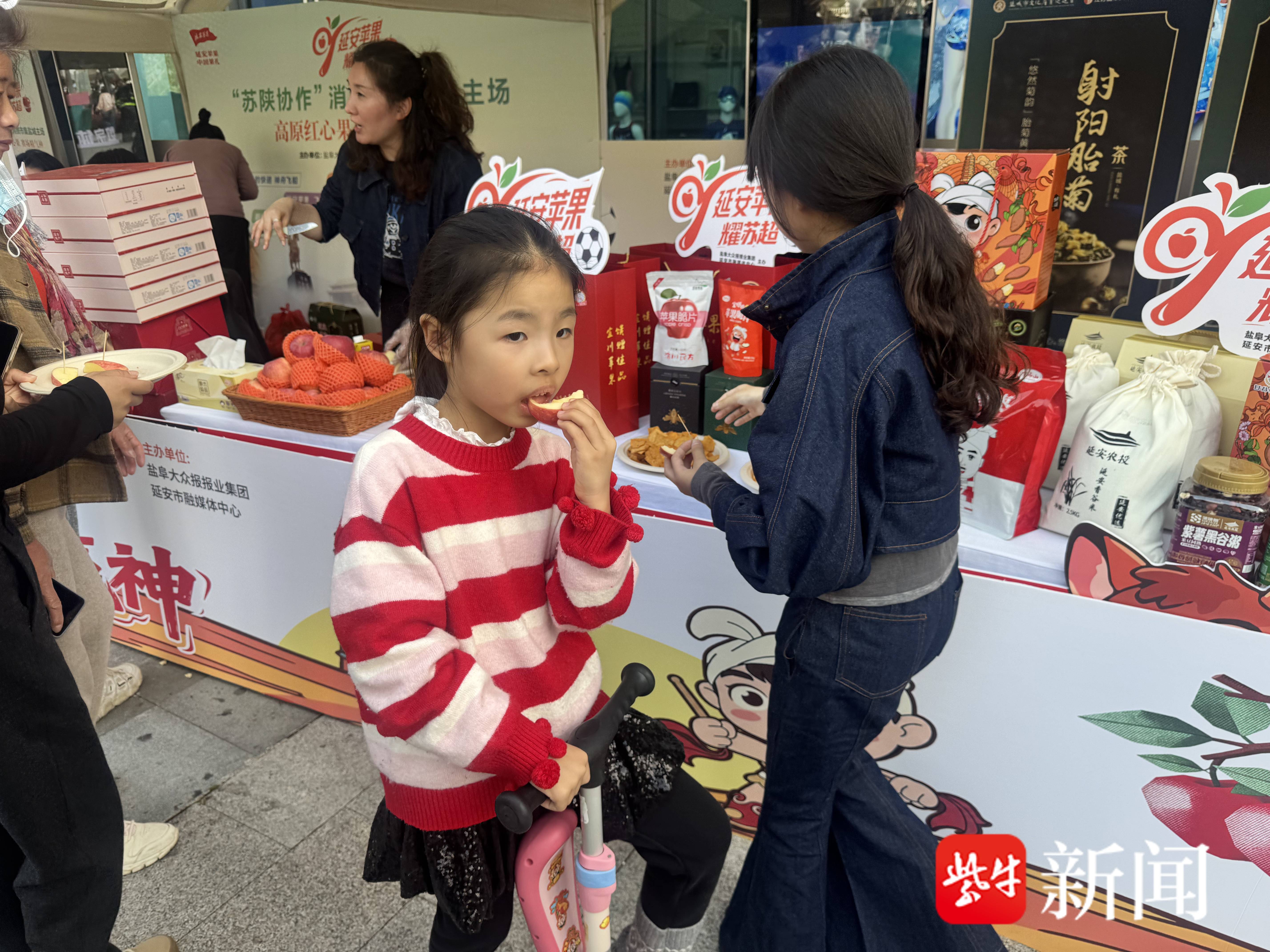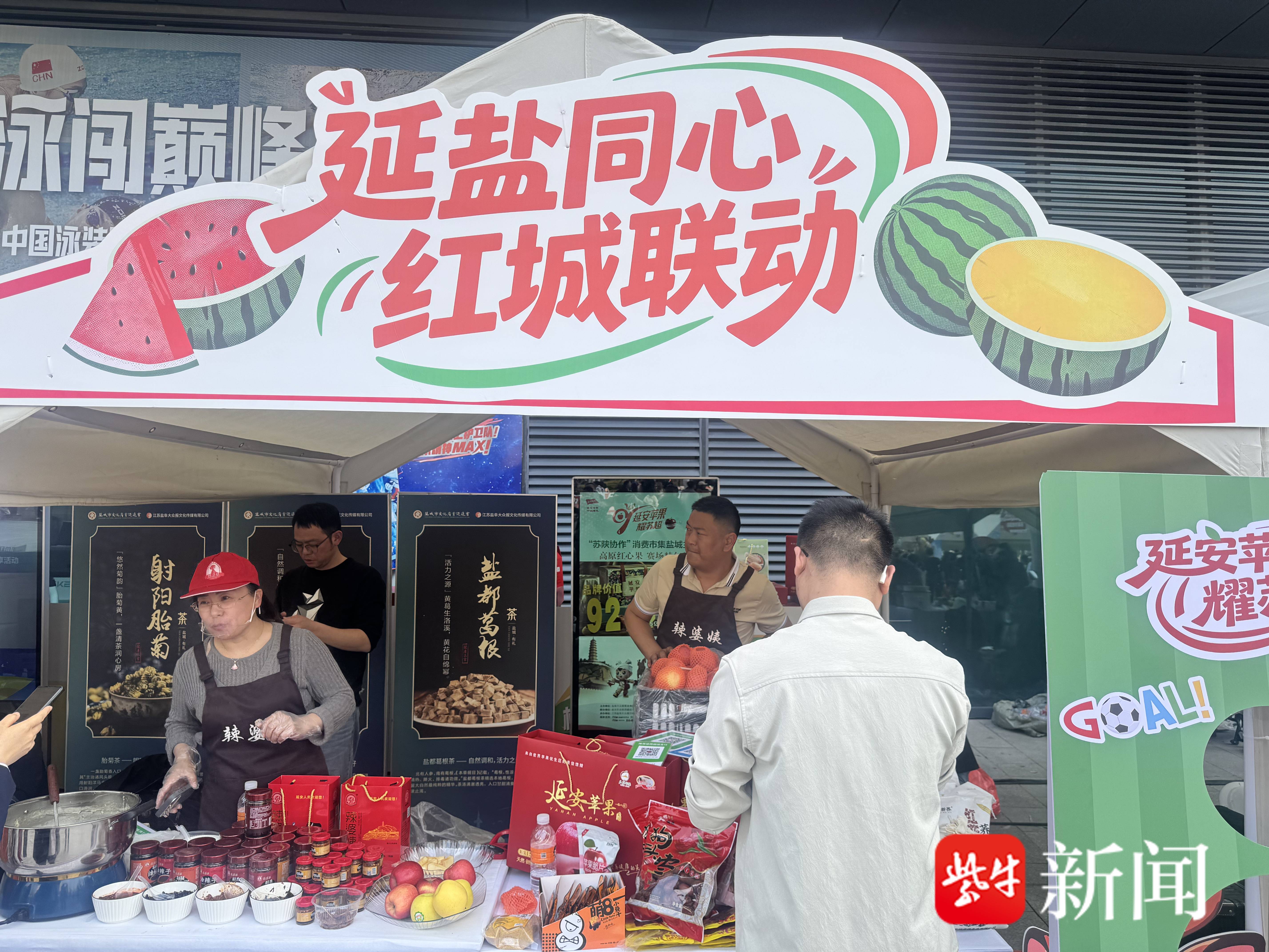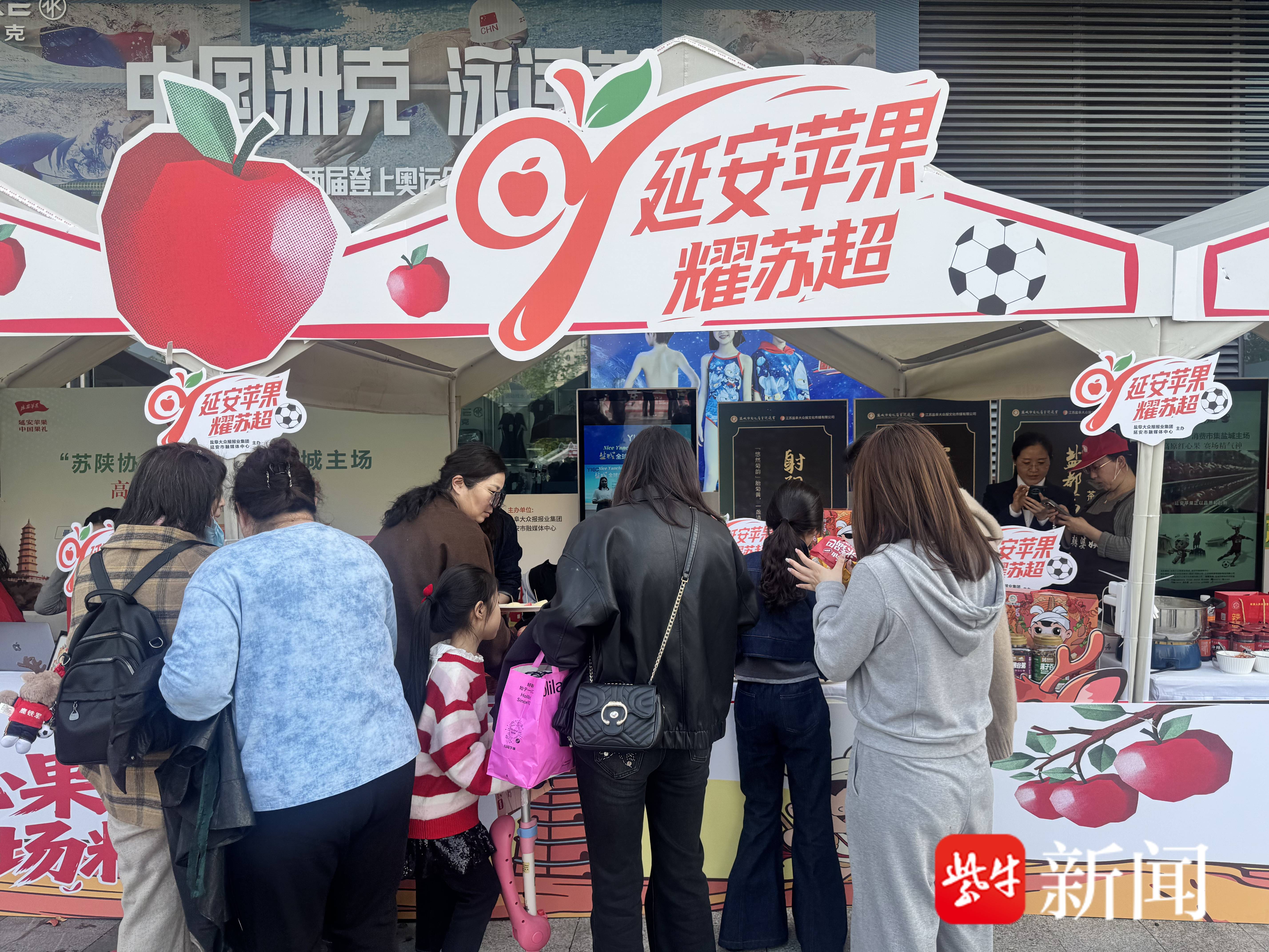 摊位上方,“延安苹果耀苏超”的主题标语醒目亮眼,与即将开赛的绿茵赛场交相辉映,直接把赛前热闹氛围拉满。除了明星产品延安苹果,一旁整齐陈列的延安小米、优质红枣、特色辣酱等多款本土农特产品琳琅满目,品类丰富、品质上乘,引得不少市民驻足围观、细心挑选、咨询采购。