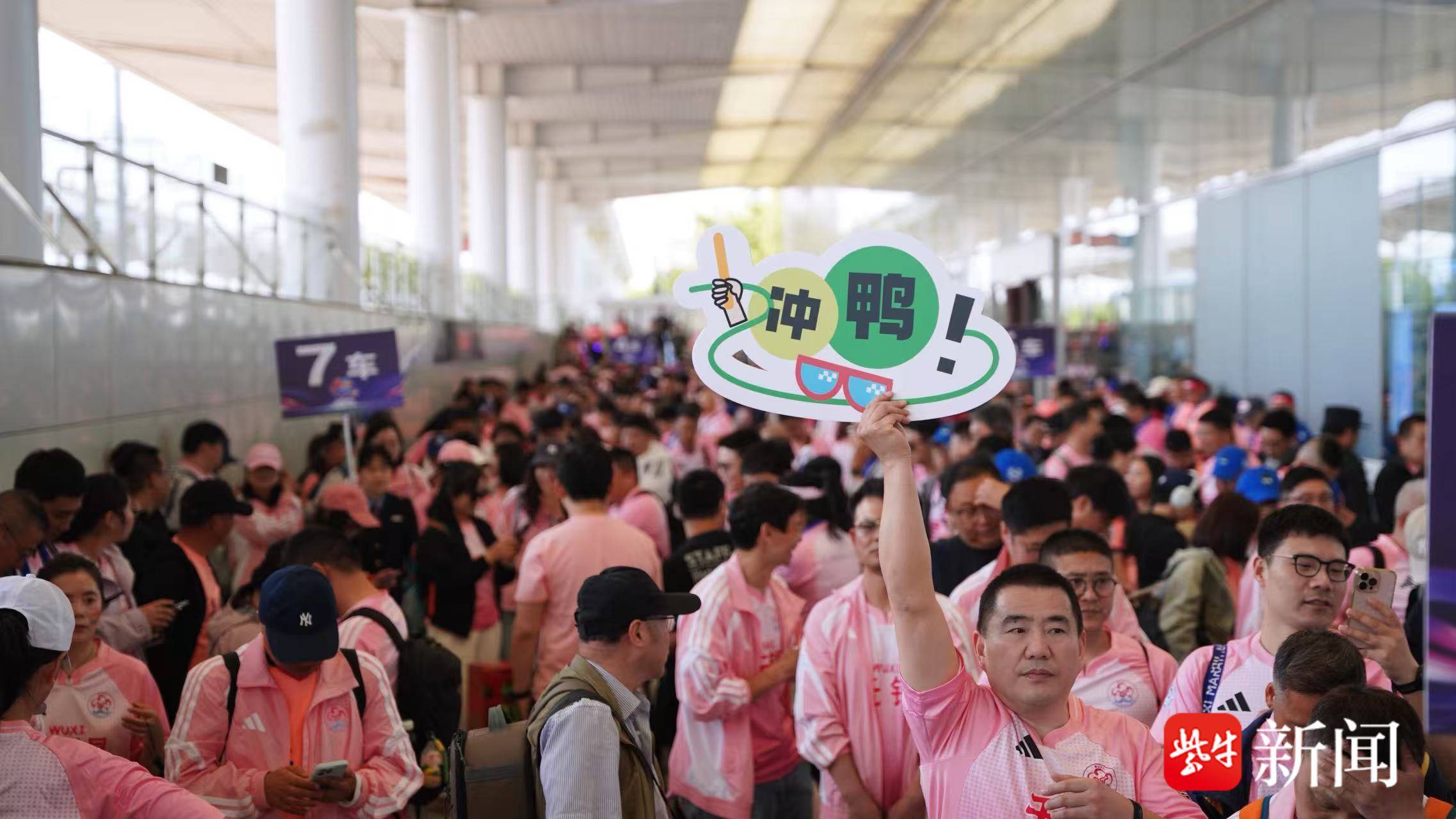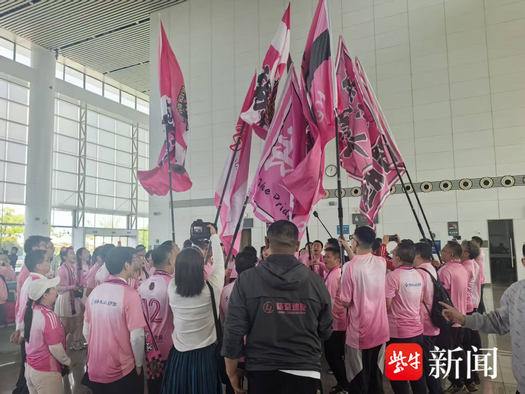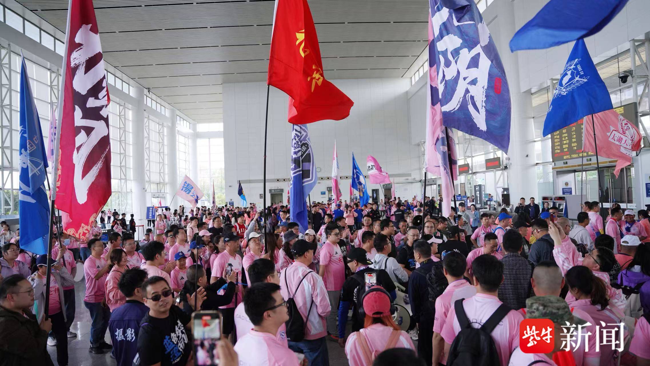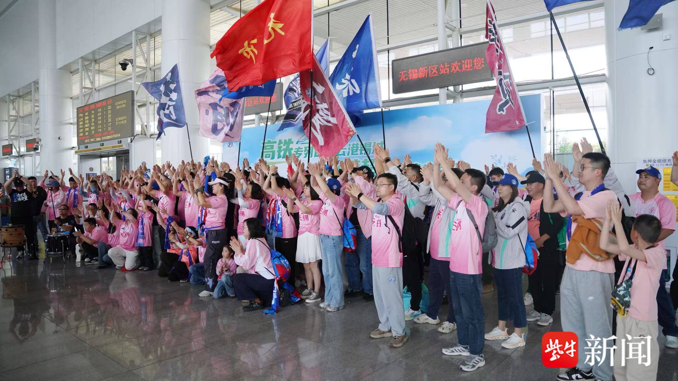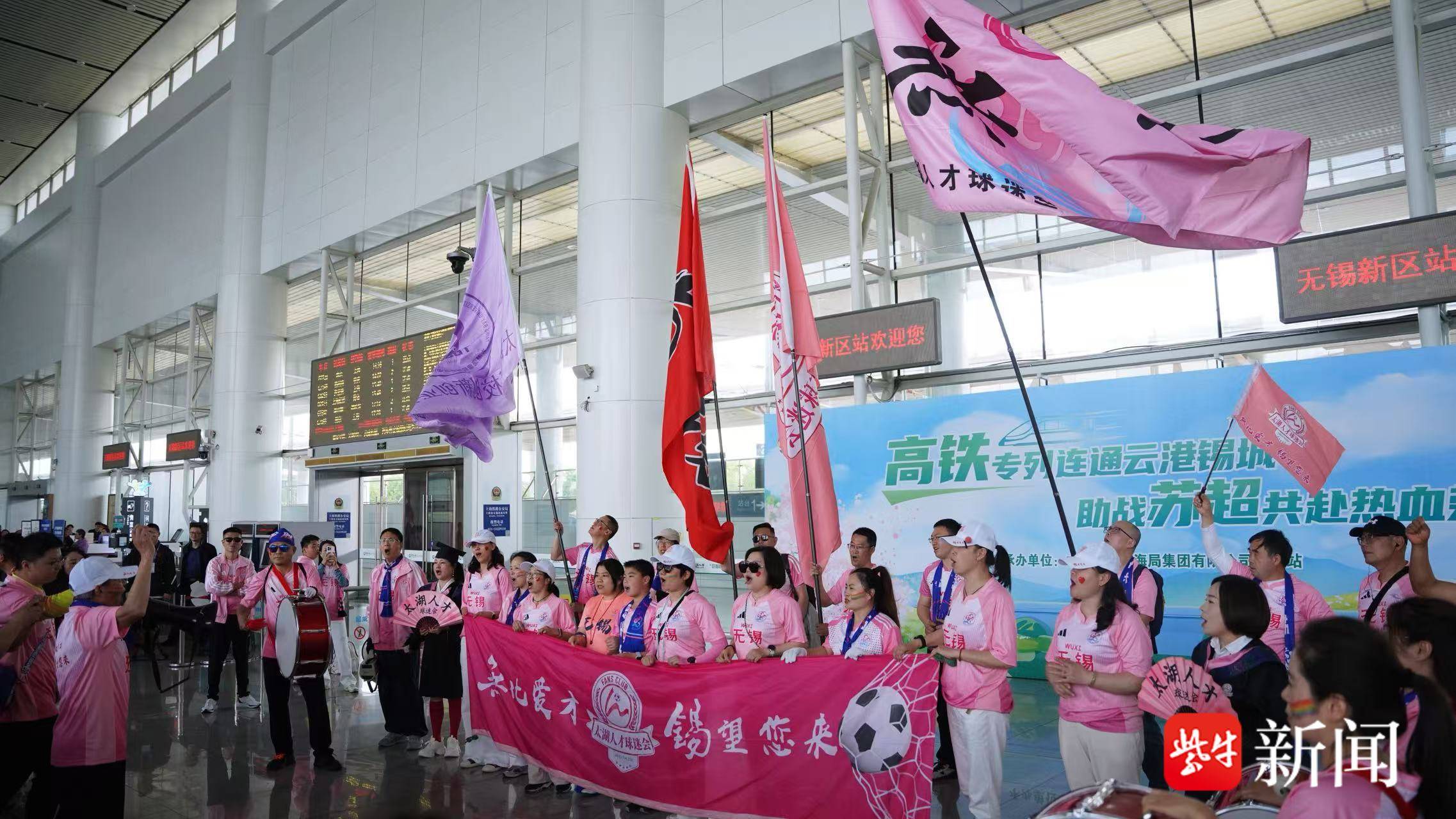 4月25日晚,“苏超”迎来新一周赛程,无锡客场对战连云港。下午1点不到,已经有球迷在铁路无锡新区站汇聚,各种互动热闹不停,现场变成粉色的海洋。简单的仪式后,球迷们开始前往站台,然后乘坐高铁G9300次列车(14:05开-17:12到连云港站)“苏超”球迷专列前往连云港,现场观赛。赛后,他们将再乘坐G9299次(连云港站22:41开-次日00:53到无锡站)“苏超”球迷专列返回无锡。