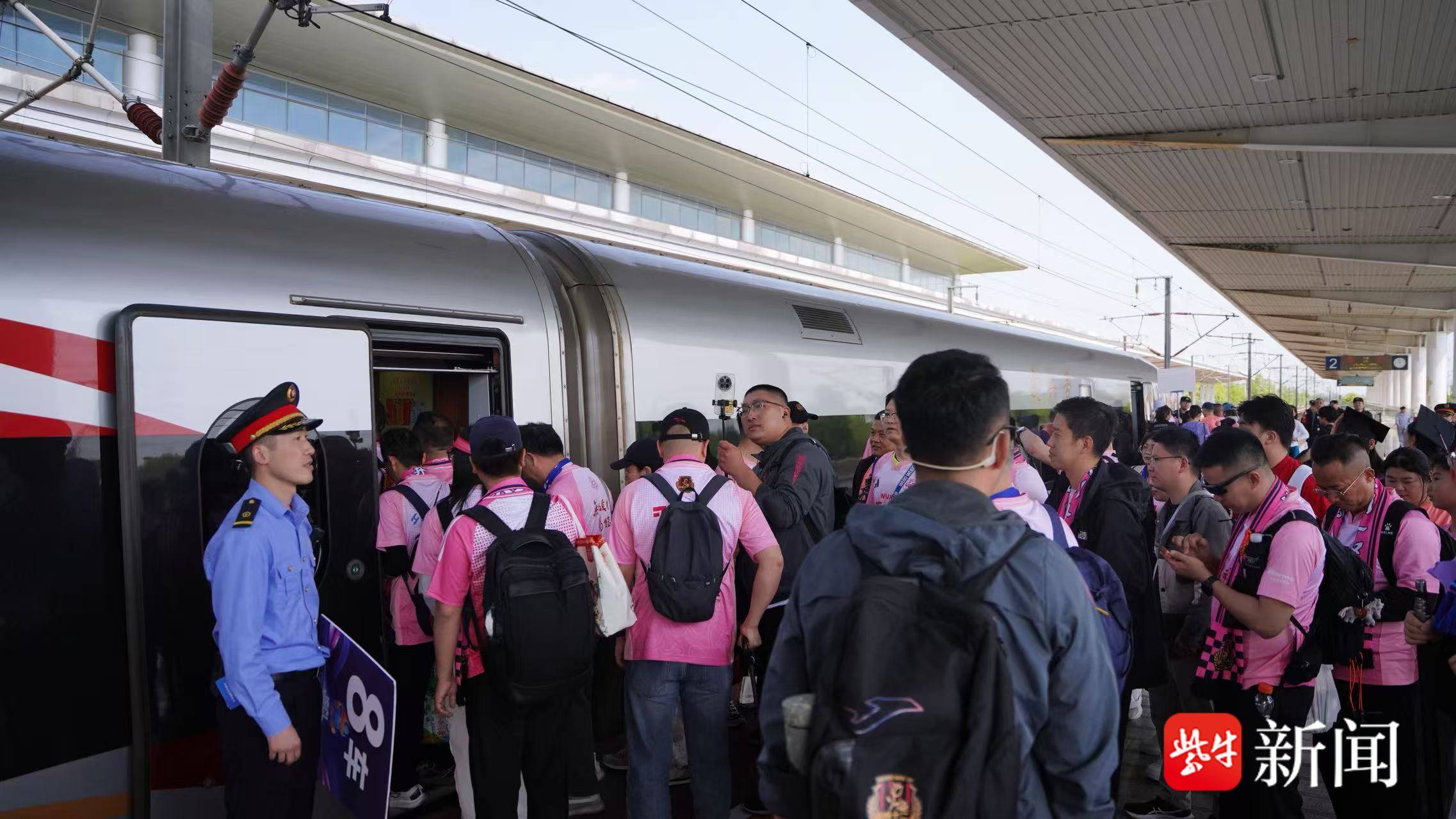 4月25日下午2点出头,载着无锡球迷的高铁G9300次列车正式出发,向连云港进发。这也是“苏超”2026赛季开始后,无锡开行的首列“苏超”球迷专列,点对点运送无锡球迷前往客场城市为球队助威。