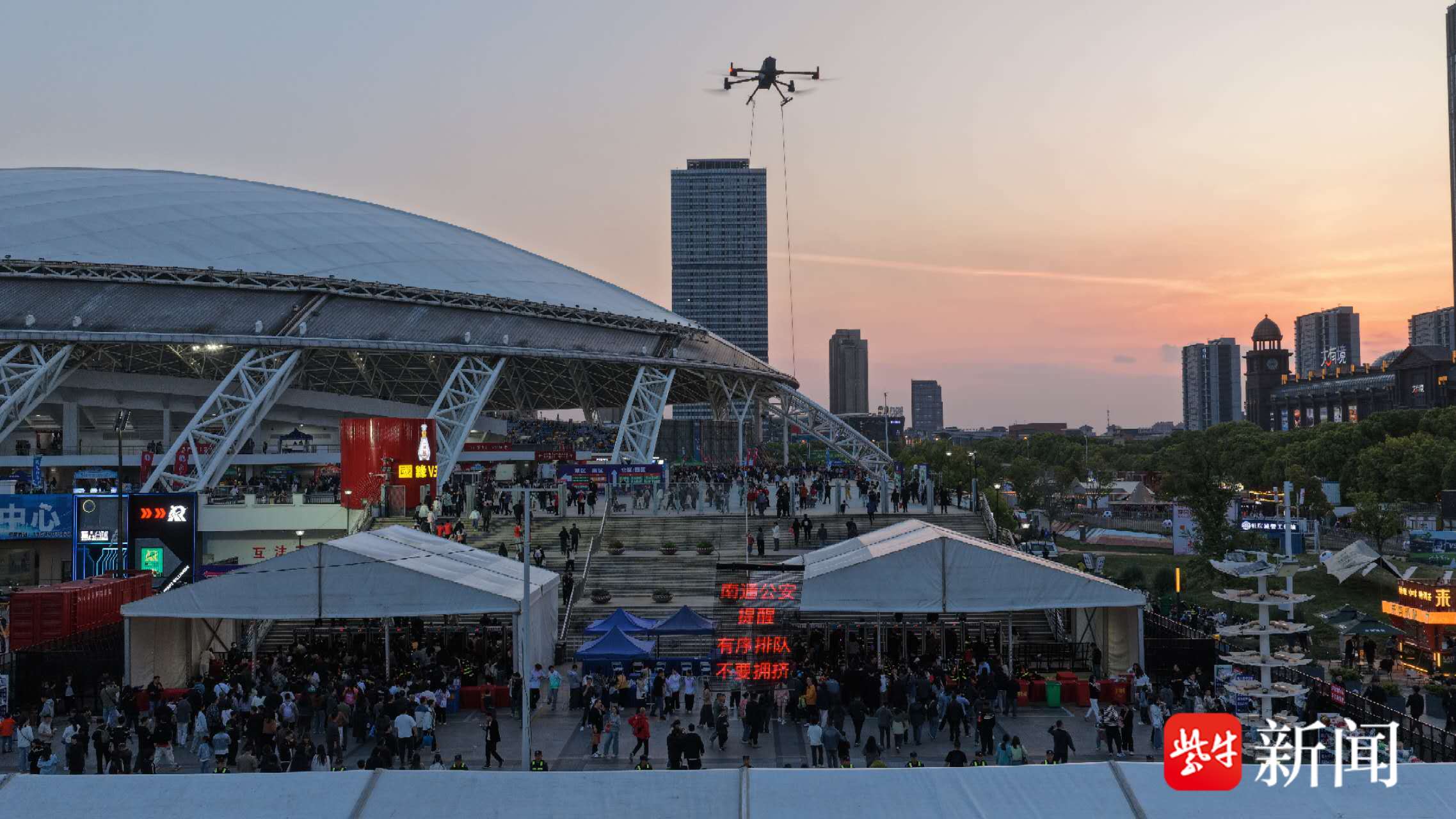 除了地面硬核装备,南通公安还搭建了空地一体的空中“智慧天眼+流动宣防”双体系,为赛事安保与平安宣传提供全维度空中支撑。其中,四架无人机和周边的三套自动化机场,搭配无人值守系统,构建起空中安防网络,实现超高清画面实时回传、远距离精准变焦、夜间低照度清晰成像,精准捕捉现场细节、实时反馈人流与交通态势,为赛事指挥调度提供有力支撑。搭载1.5平方米定制化飞天卷轴屏的无人机,则在高空稳定展示赛事安保宣传、安全防范提示、反诈警示标语等内容,成为极具视觉冲击力的空中宣防阵地。
