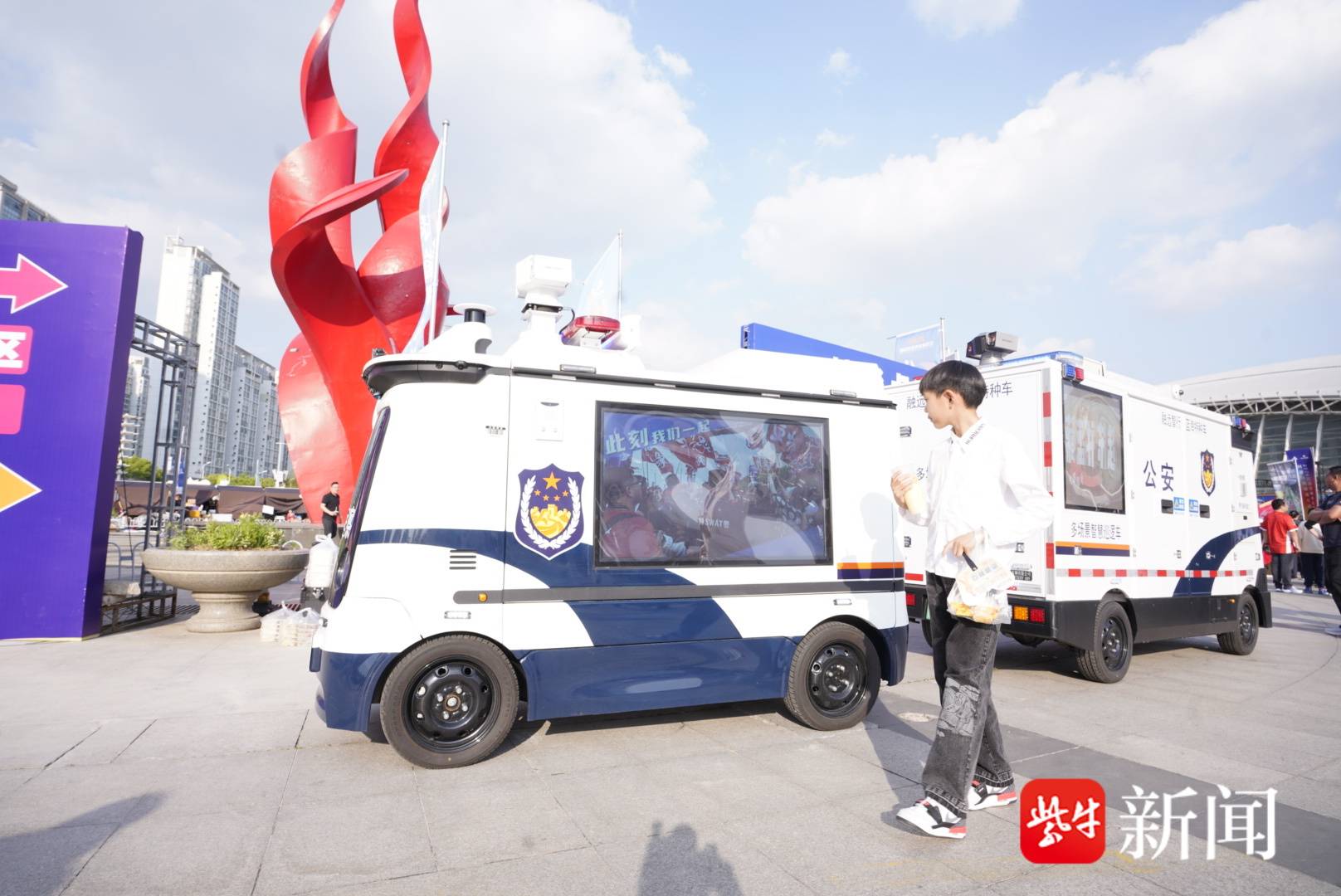 当天下午,两辆无人宣防车在南通体育会展中心周边开启不间断巡逻。两车均具备L4级自动驾驶能力,配备多个高清摄像头,帮助警方第一时间掌握赛场周边动态,同时搭载高清双面宣传屏、定向扩音系统,循环播放防骗宣传片、安全提示音频,把反诈知识送到市民身边,车内应急物资储物舱还配备了急救物资、便民用品,实现宣防无死角、服务不打烊。
