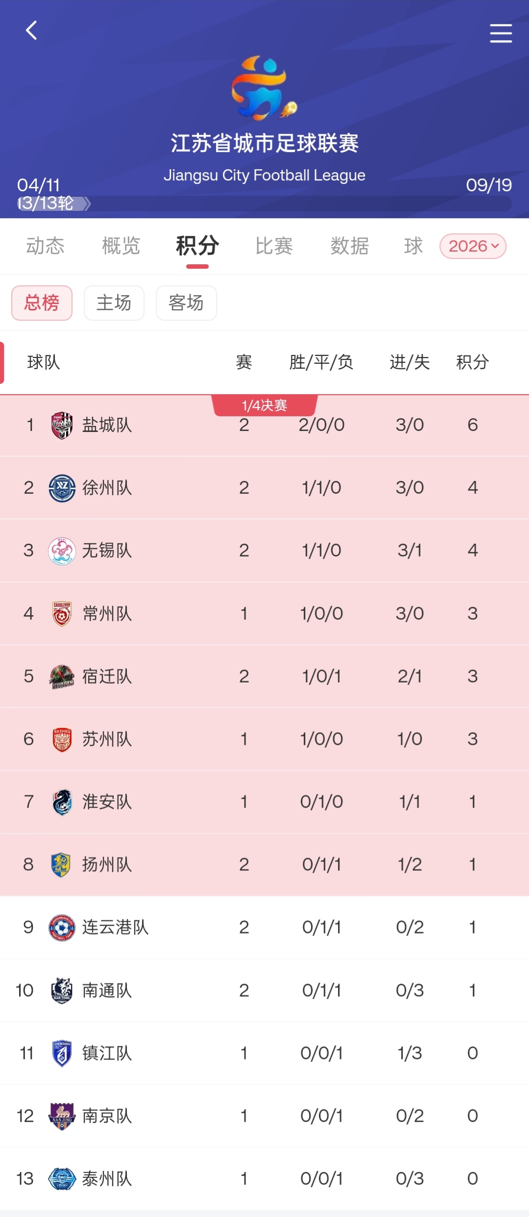 在积分榜上紧随其后的是徐州队和无锡队。这两支队伍目前均取得了1胜1平的战绩,同积4分,分别暂列第二和第三位。常州队目前少赛一轮,以1战全胜积3分位列第四;而在此前刚刚与盐城队上演过激烈交锋的宿迁队,目前以1胜1负积3分的成绩暂列第五名。