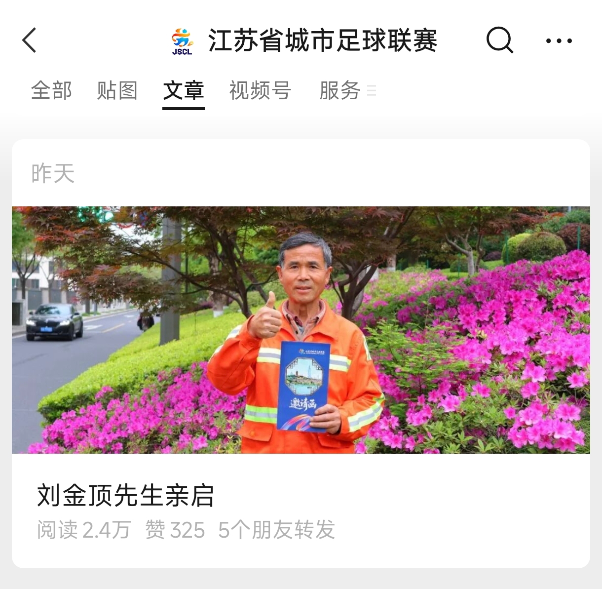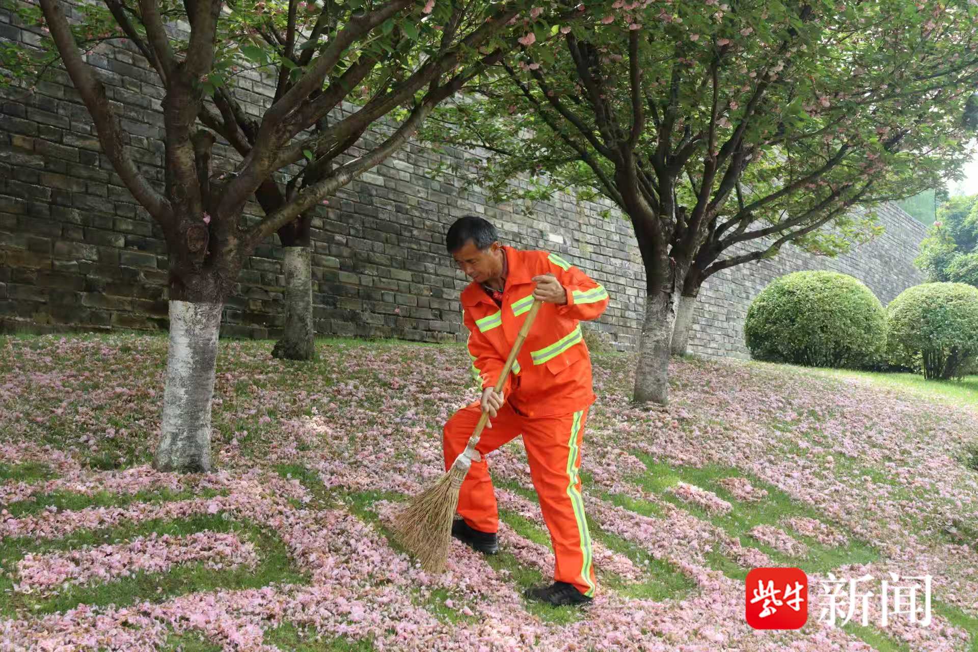 刘金顶的举动也打动了江苏省城市足球联赛组委会。江苏省城市足球联赛组委会官方微信公众号发布了一封题为《刘金顶先生亲启》的信。信中写道:“今年你又以笤帚为‘笔’、落花为‘墨’,在这明城墙的脚下,工工整整地写下‘南京♡苏超’。你用最质朴的匠心,为这座城市的春天添加了一抹靓丽的粉色。”