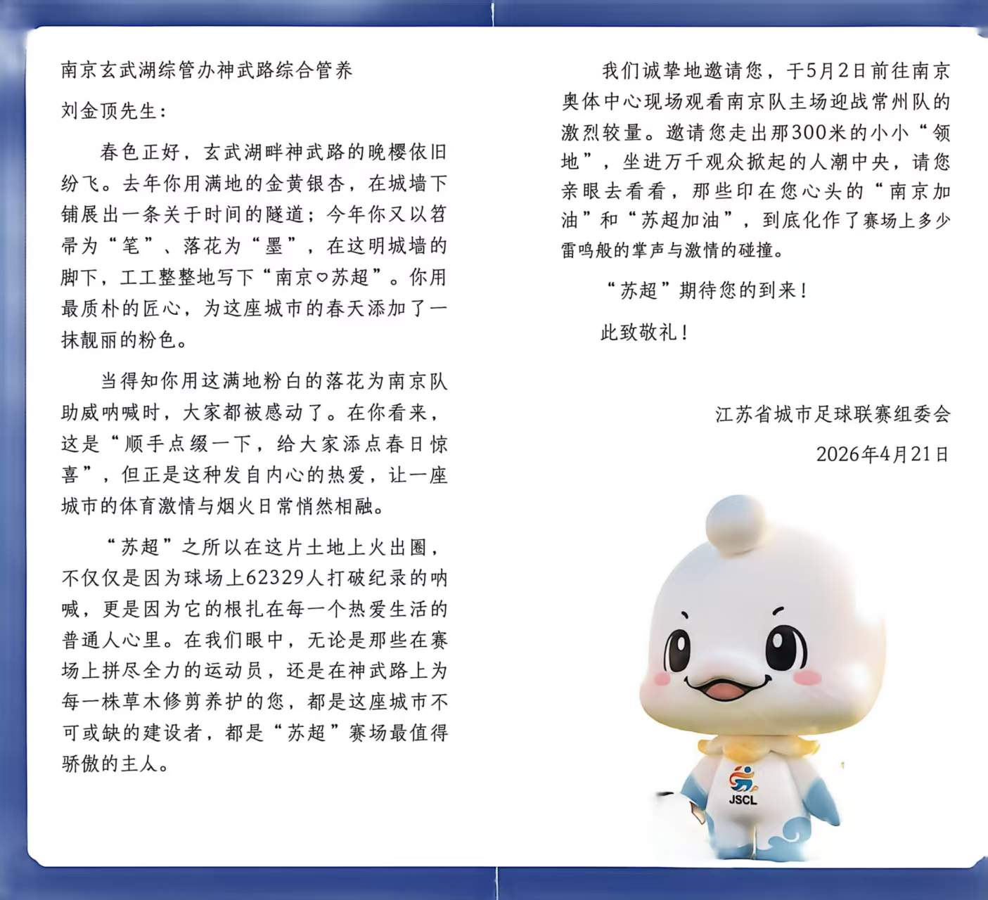 “我们诚挚地邀请您,于5月2日前往南京奥体中心现场观看南京队主场迎战常州队的激烈较量。邀请您走出那300米的小小‘领地’,坐进万千观众掀起的人潮中央,请您亲眼去看看,那些印在您心头的‘南京加油’和‘苏超加油’,到底化作了赛场上多少雷鸣般的掌声与激情的碰撞。”收到邀请后,刘金顶激动又腼腆:“我就是一名普普通通的劳动者,没想到能得到主办方和社会各界的关注与认可。我以前不了解‘苏超’,这次‘苏超’又给我邀请函,心里真的特别激动,特别开心。”