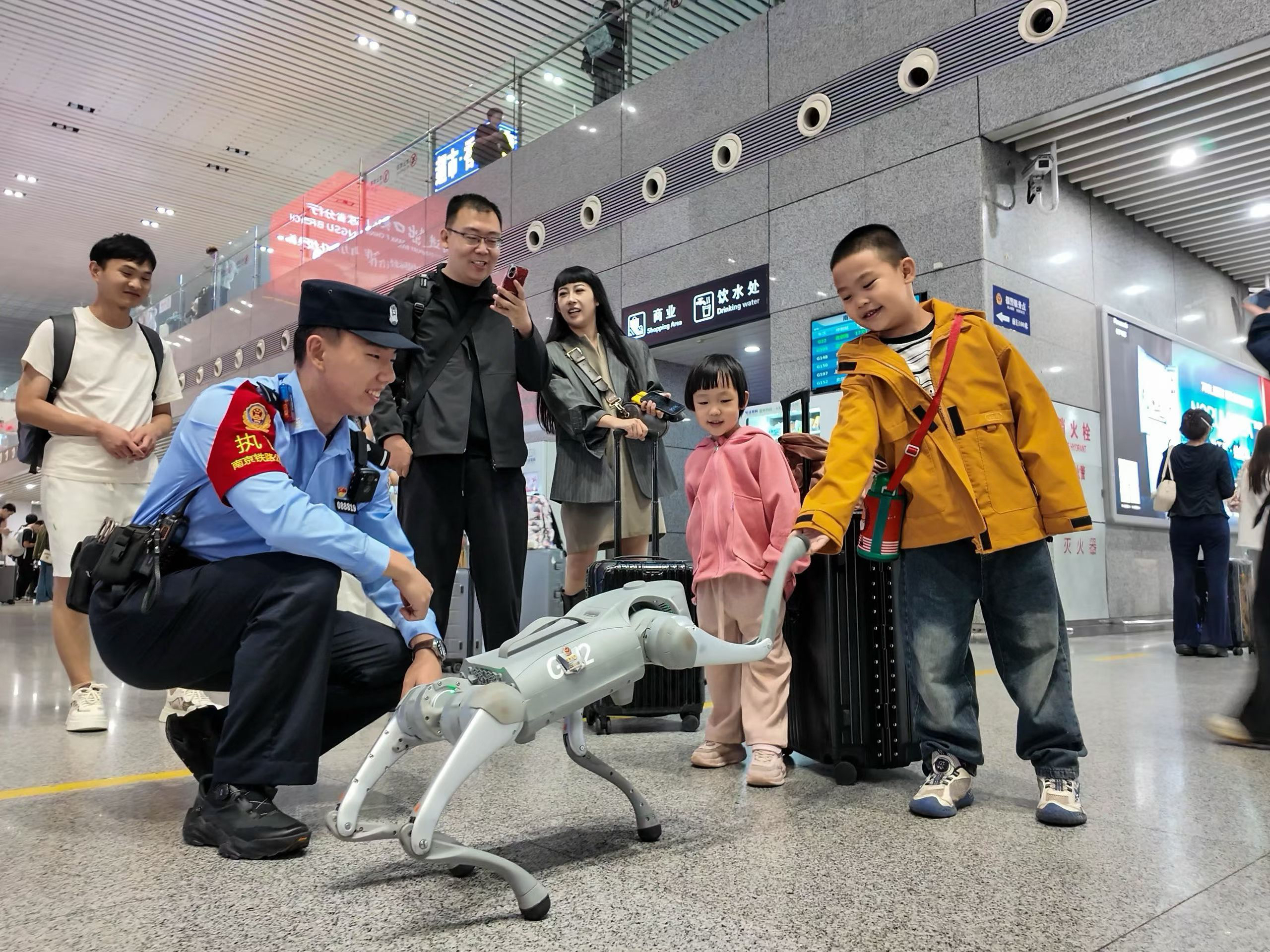 公安处坚持显性用警与便衣打击相结合,动态布警与重点管控相补充,全面强化社会治安整体防控。按照“打防并举”原则,该处依托“客流热力图”推行“日勤制”“潮汐制”布警,在站前广场、进出站口、候车室、检票口、站台等人员密集区域等重点部位投放警力,实时分流旅客,确保安全有序乘降。依托机器人“小安”、机器狗科技赋能,增强补充警力,在南京南站配合民警加强巡逻巡查频次,采用步巡、车巡、视频巡控、机器人巡等多种方式,织密防控网络。联合铁路企业、地方警方等力量,强化安检查危督导,坚决将危险品堵在站外车下。针对大客流,提前设置疏导缓冲区,优化流线安排,防止发生拥挤踩踏。