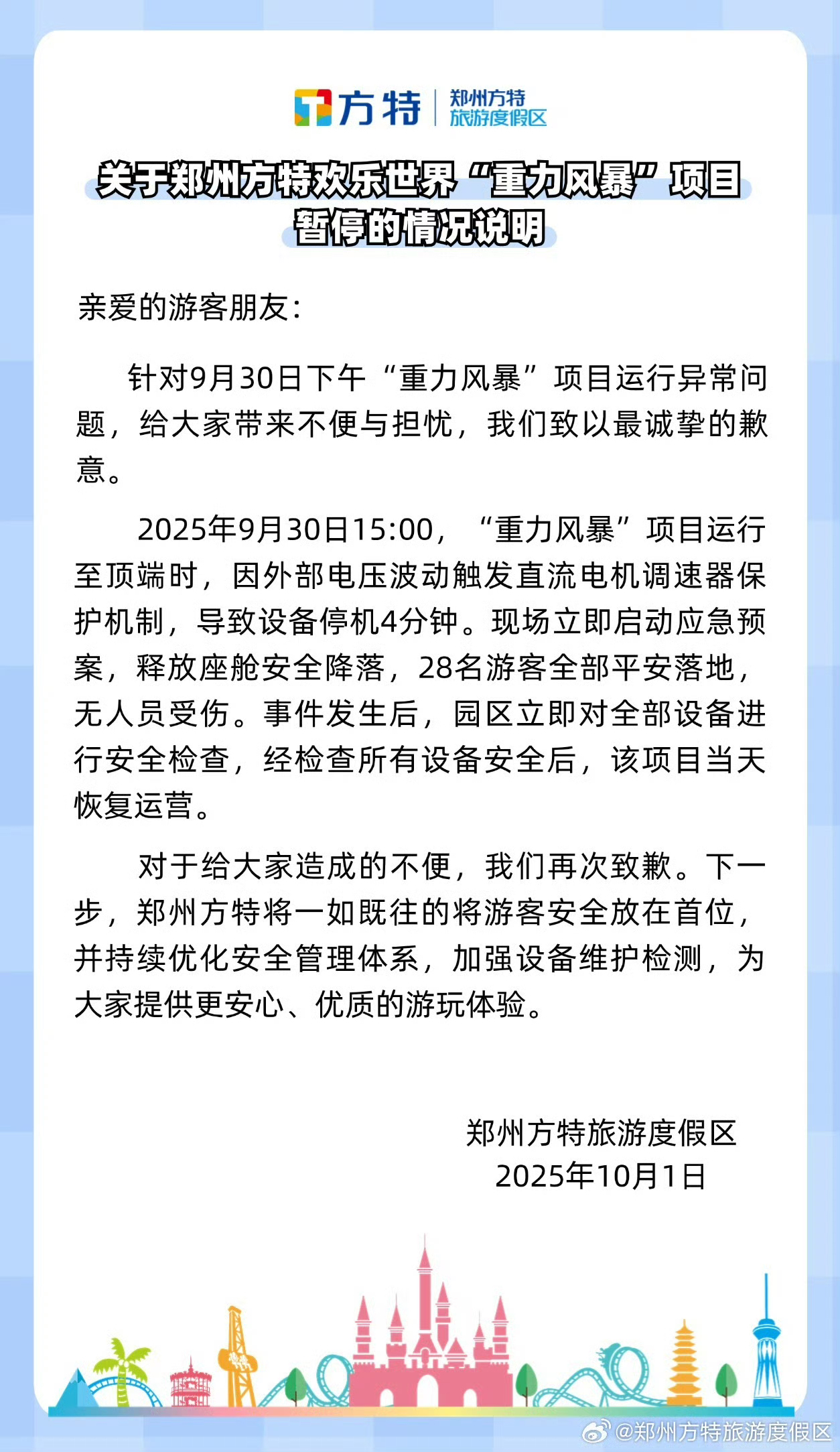 10月1日晚间,@郑州方特旅游度假区 发布《关于郑州方特欢乐世界“重力风暴”项目暂停的情况说明》: