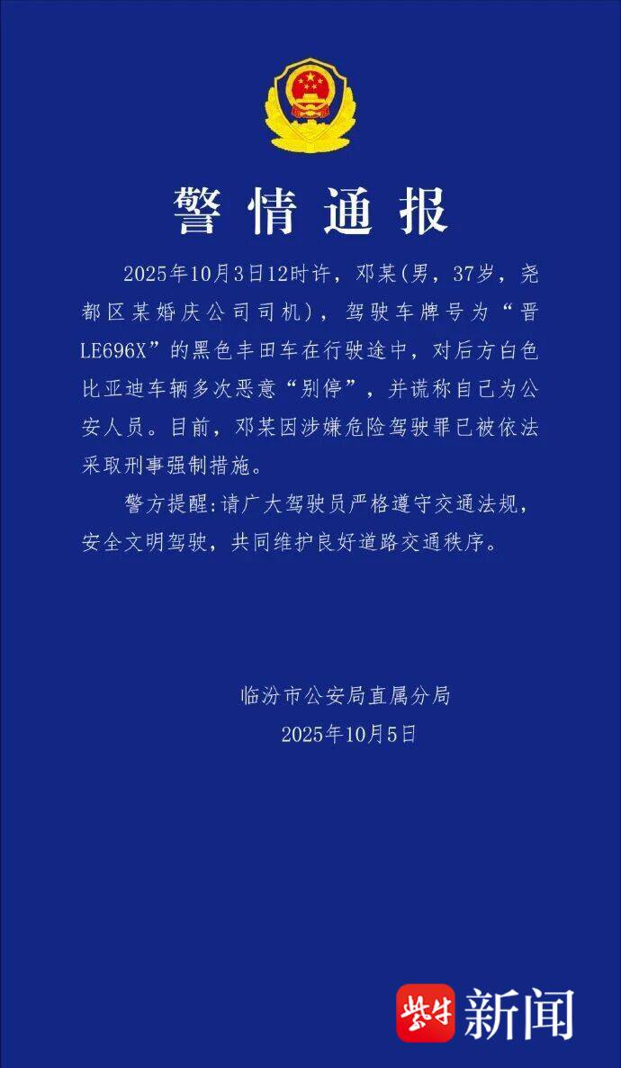 10月5日上午,扬子晚报/紫牛新闻记者注意到,山西临汾市公安局直属分局发布警情通报:2025年10月3日12时许,邓某(男,37岁,尧都区某婚庆公司司机),驾驶车牌号为“晋LE696X”的黑色丰田车在行驶途中,对后方白色比亚迪车辆多次恶意“别停”,并谎称其为公安人员。