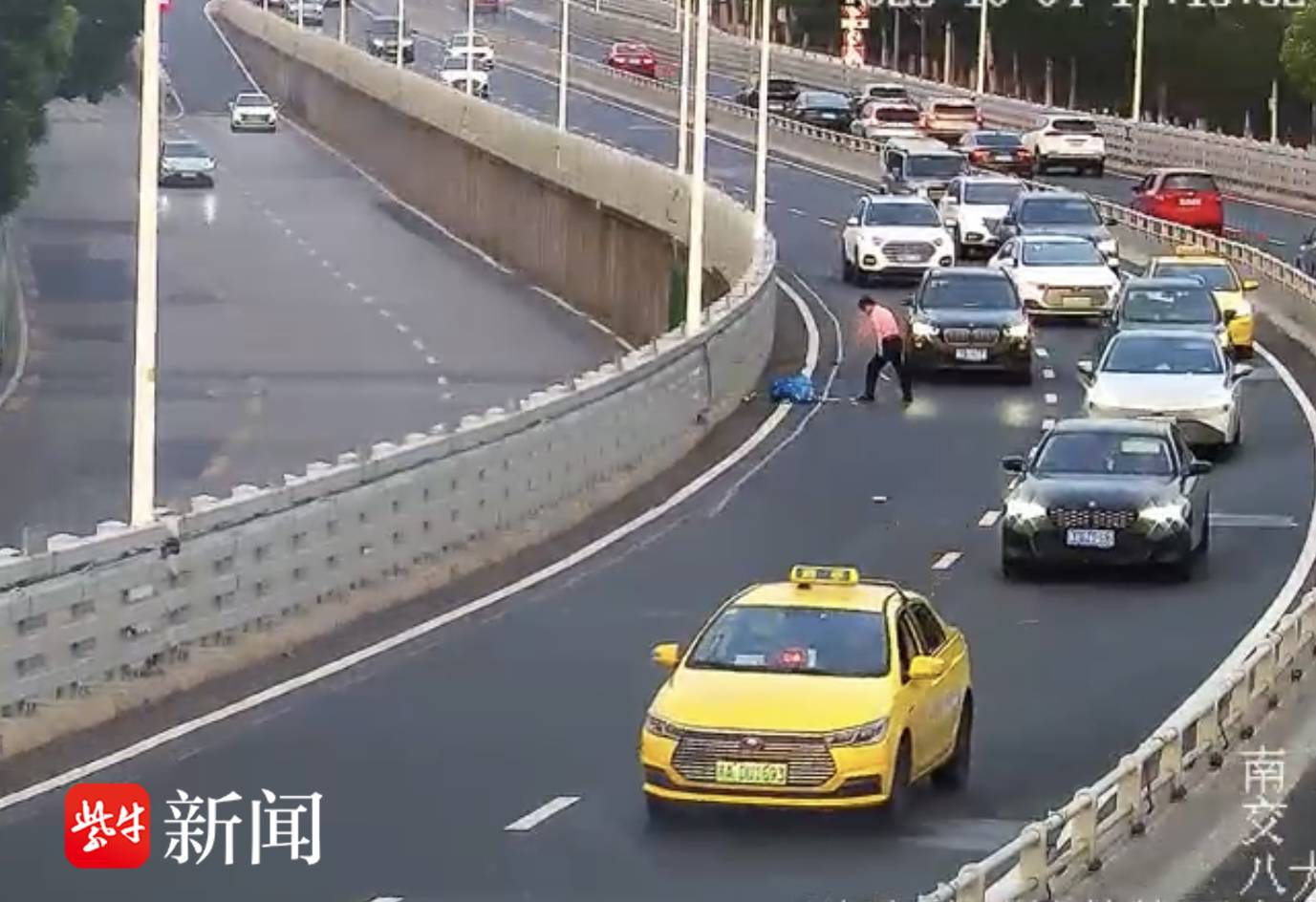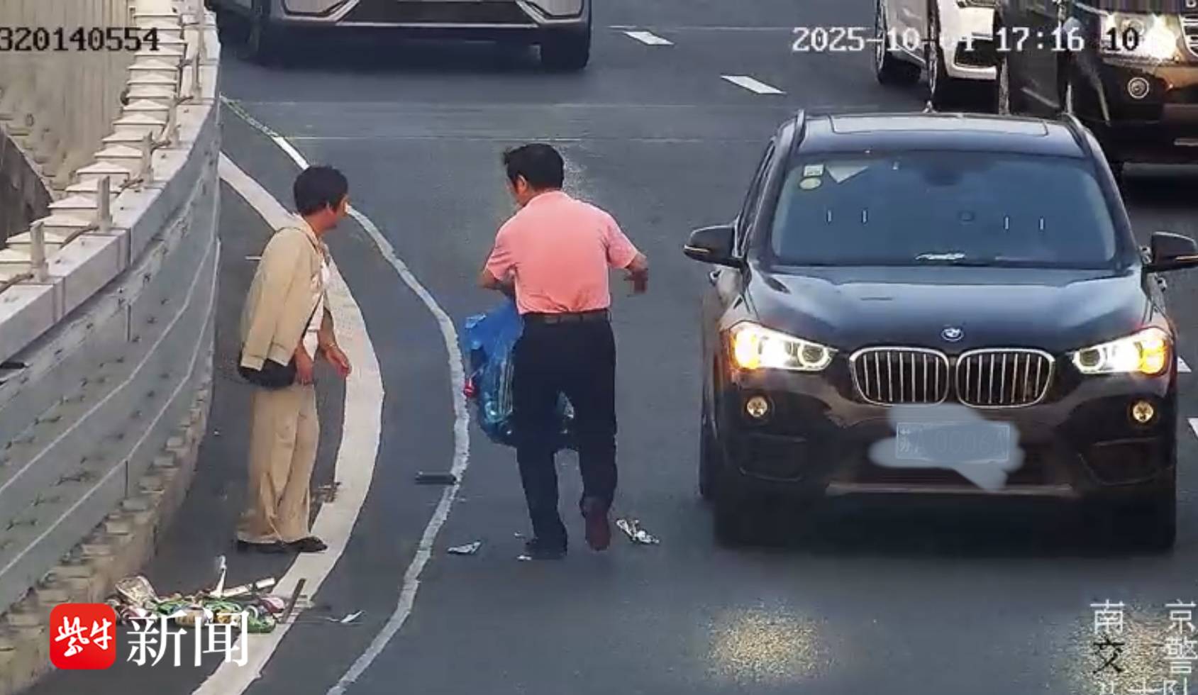 10月4日17时14分许,南京机场高速连接线北向南方向发生惊险一幕:一辆蓝色小货车因货物捆扎不牢,导致一袋装有易拉罐和铁块的杂物掉落,占据最右侧行车道,阻碍交通。由于正值国庆假期车流高峰,后方车辆纷纷绕行,险象环生。不久,一辆路过的宝马轿车停下,司机迅速上前将杂物清理。