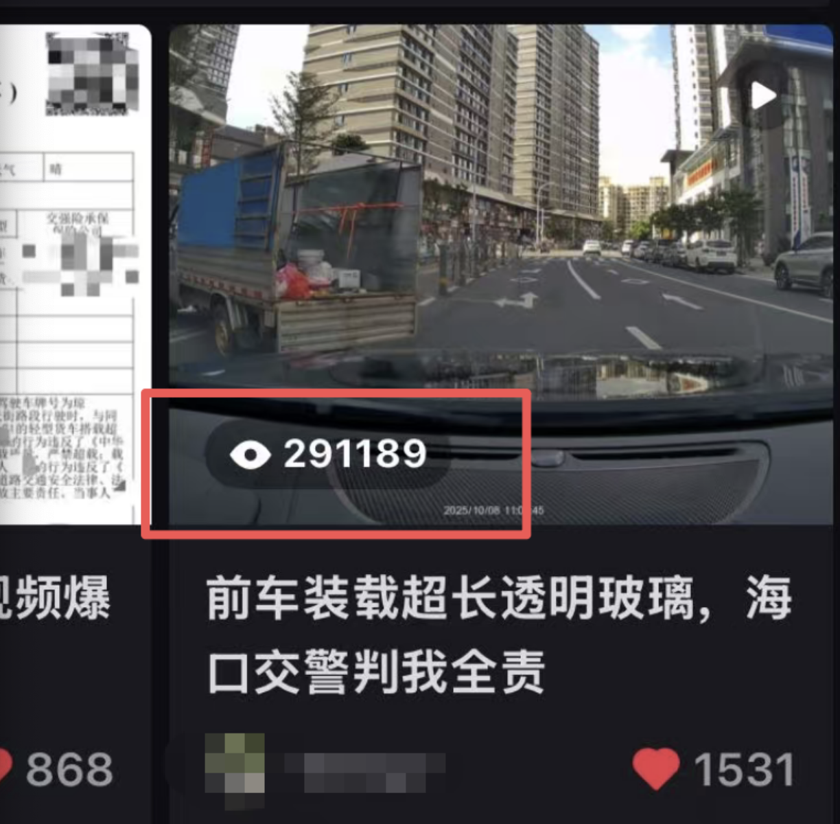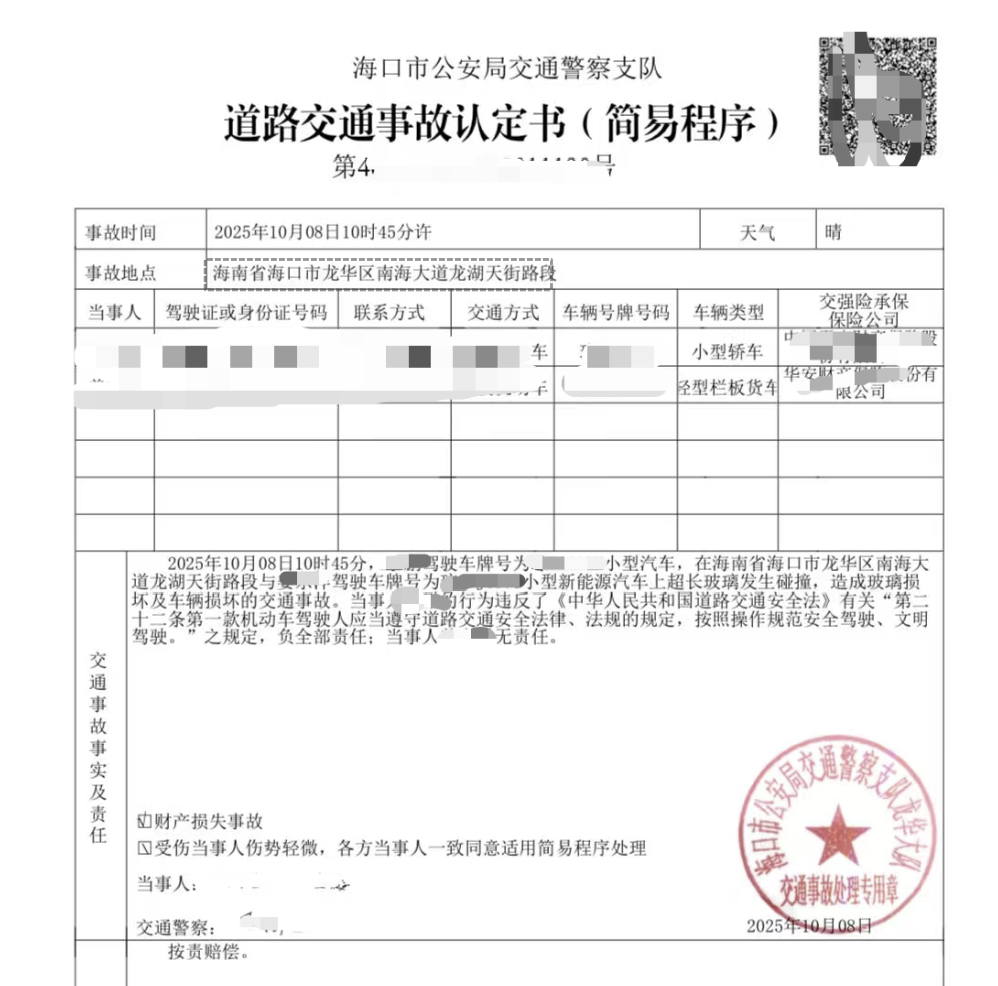 10月12日,海南市民王先生(化名)收到了交警部门的第二份责任认定书——此前因撞上前方装载超长透明玻璃的货车被判定“全责”的他,最终被“改判”为次要责任,涉事货车因“超长装载”承担事故主要责任。这一结果,距离10月8日事故发生已过去4天,期间王先生上传的行车记录仪视频在社交平台传播,引发近30万网友关注与讨论。