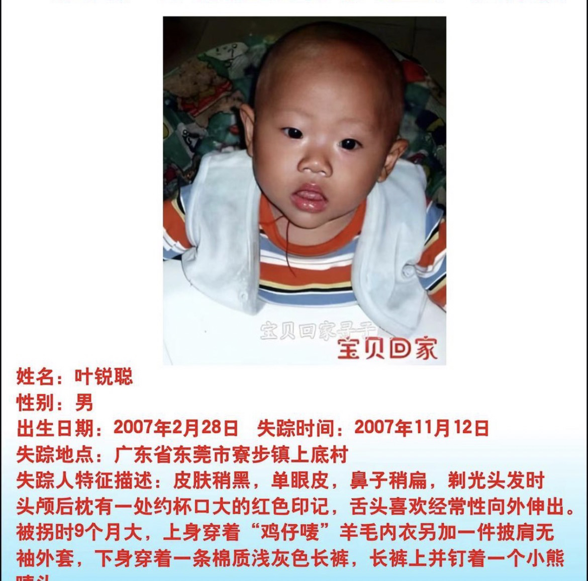 据叶锐聪家属的寻亲启事显示,2007年11月12日,9个月大的叶锐聪在家门口被抢走,当时其家人拼命追赶并报警,仍未追回孩子。据家属的寻人启事显示,叶锐聪的失踪地点为,广东省东莞市寮步镇上底村。