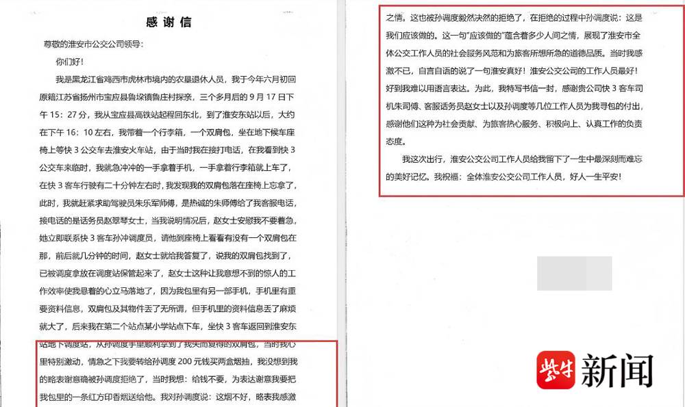 扬子晚报网10月22日讯(通讯员 陈益平 记者 朱鼎兆)近日,远在黑龙江省鸡西市的旅客张先生,将一封饱含感激之情的《感谢信》寄到了淮安公交公司。“在拒绝(物质感谢 记者注)的过程中孙调度说:这是我们应该做的。这一句‘应该做的’蕴含着多少人间之情……当时我感激不已,自言自语的说了一句淮安真好……”。信中字里行间满是对淮安公交驾驶员、服务热线工作人员和调度员的诚挚谢意,赞扬他们用高效贴心的服务,为外地旅客撑起公交出行“暖心伞”。