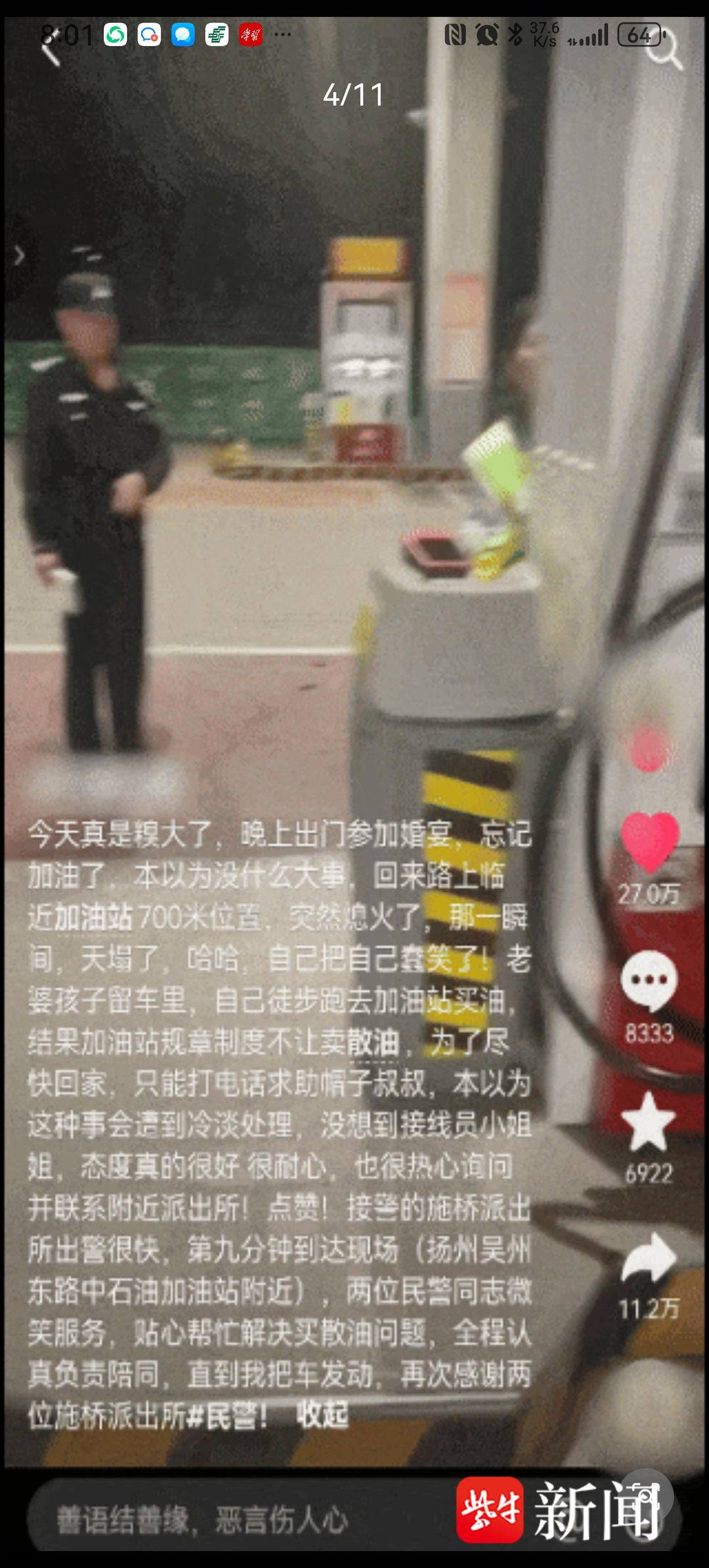 扬州市公安局经开区分局施桥派出所接到求助后,值班民警立即出发,9分钟赶到现场。“您别着急,我们来帮您想办法。”民警一边安抚焦虑的徐先生,一边与加油站沟通。随后依照程序,在确保安全的前提下,以公安机关名义进行担保并完成登记核查,帮徐先生顺利买到了应急燃油。考虑到夜间安全,民警并未就此离开,而是护送徐先生返回停车点,全程协助加注燃油。直到车辆成功启动、平稳运行,确认一家人能安全返程后,才放心离去。