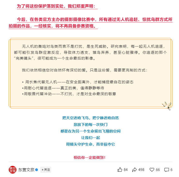 对于此事,3日东营市文化和旅游局发文做出回应,直言无人机的闯入让天空变成了鸟群的刑场,“一次次受伤的鸟儿,一个生命的逝去,让我们不得不再次正视:拍摄的边界在哪里?”东营文旅介绍,无人机的轰鸣对鸟类而言不是打扰,是生死威胁。研究表明,每一起无人机追逐,都可能引发鸟群应激反应,导致体力透支、雏鸟弃养,甚至心脏骤停。“你追逐的那个“完美镜头”,很可能成为一个生命最后的影像。”倡议用长焦代替无人机,用耐心代替追逐,并郑重声明:“今后,在各类官方主办的摄影摄像比赛中,所有通过无人机追赶、惊扰鸟群方式所拍摄的作品,一经核实,将不再具备参赛资格。”
