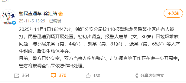 2025年11月1日18时47分,徐汇公安分局接110报警称龙吴路某小区内有人被打,民警迅速到场开展处置。经初步调查,报警人詹某(女,30岁)因垃圾堆放问题,与邻居朱某(男,44岁)、刘某(男,81岁)、张某(男,65岁)等人产生纠纷,后发生肢体冲突。