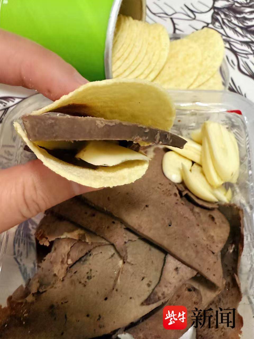 带着对这款网红美食的好奇,记者也购入了猪肝、薯片、大蒜三样食材展开实测。其中,猪肝选用的是商超常见的卤制款,自带咸香风味;薯片则为预调味类型,本身就带有浓郁口感。因此尽管生蒜气味较冲,但在卤肝的咸香与薯片的酥脆风味中和下,整体搭配的口感意外和谐,吃的时候蒜味并未过于突出。不过需要特别提醒的是,大蒜的气味具有“持久性”,即便食用时感受不明显,后续口腔内的蒜味却不易消散,对于注重口腔环境的网友来说,还是建议谨慎尝试。