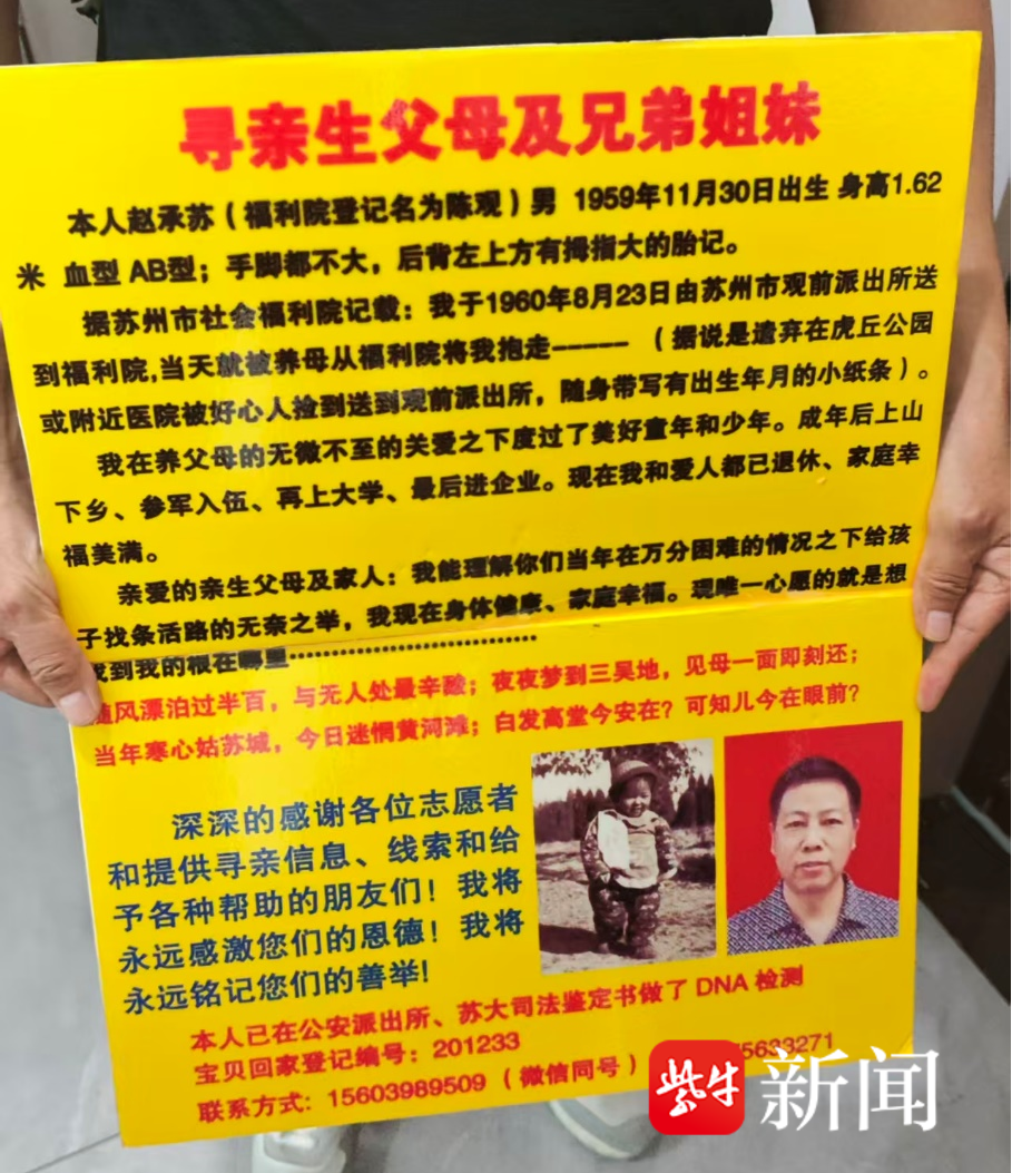 目前,赵承苏已在公安机关采血入库,经过祖源分析推测其家人大概是在苏州市吴中区、相城区和吴江区一带,他希望了解相关信息的朋友能为其提供线索。如您掌握相关线索,欢迎与我们联系:扬子晚报 025-96096 热线电话。