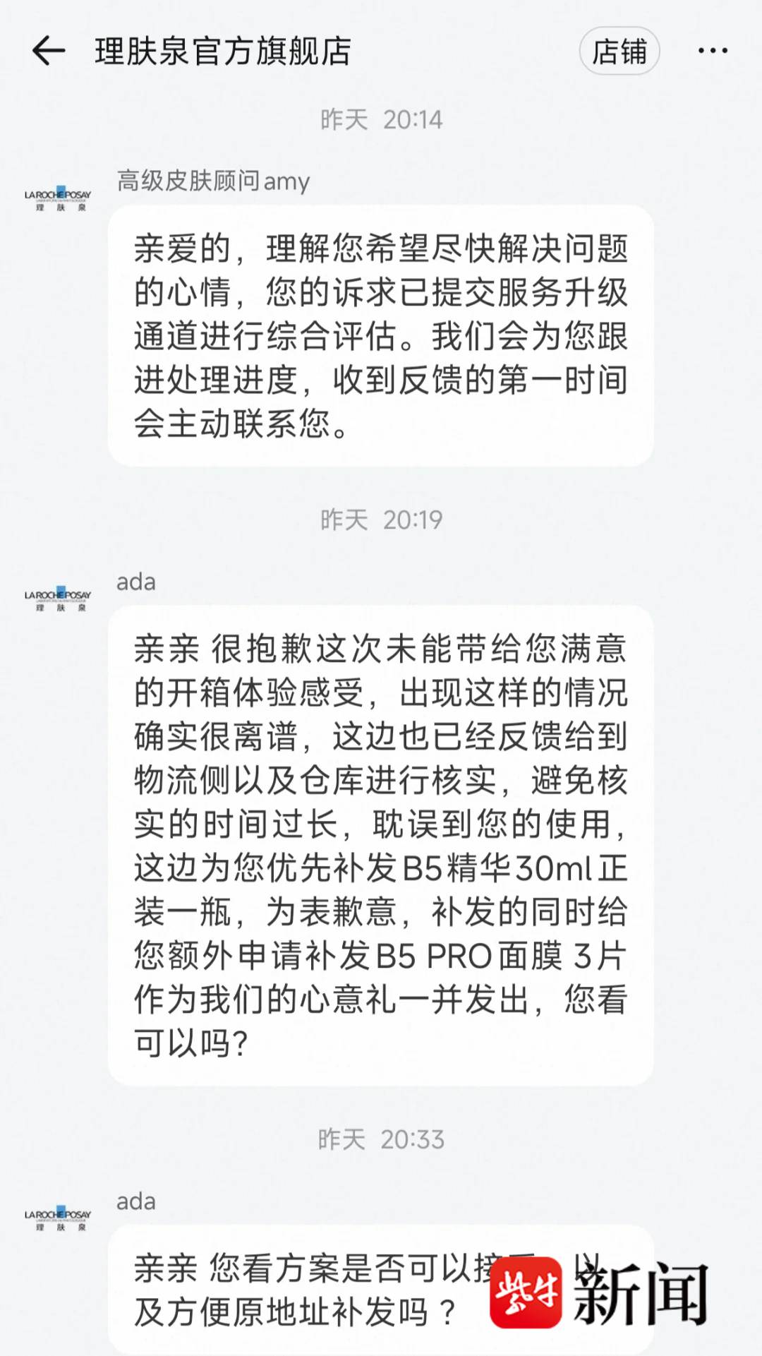 发现异常后,胡女士第一时间就拍照留证,并和官方客服沟通了。“晚上6点沟通,大概8点就收到了客服反馈”,她表示,客服先了解具体情况后向上反馈,整个等待过程 “在可接受范围内”。客服回应称,已将此事同步至物流侧和仓库核查,为避免核实过程耗时过长影响用户体验,已先行为网友补发了同款B5精华正装,同时为表达歉意,额外申请补发了面膜作为补偿。目前,胡女士已收到补发商品的单号。