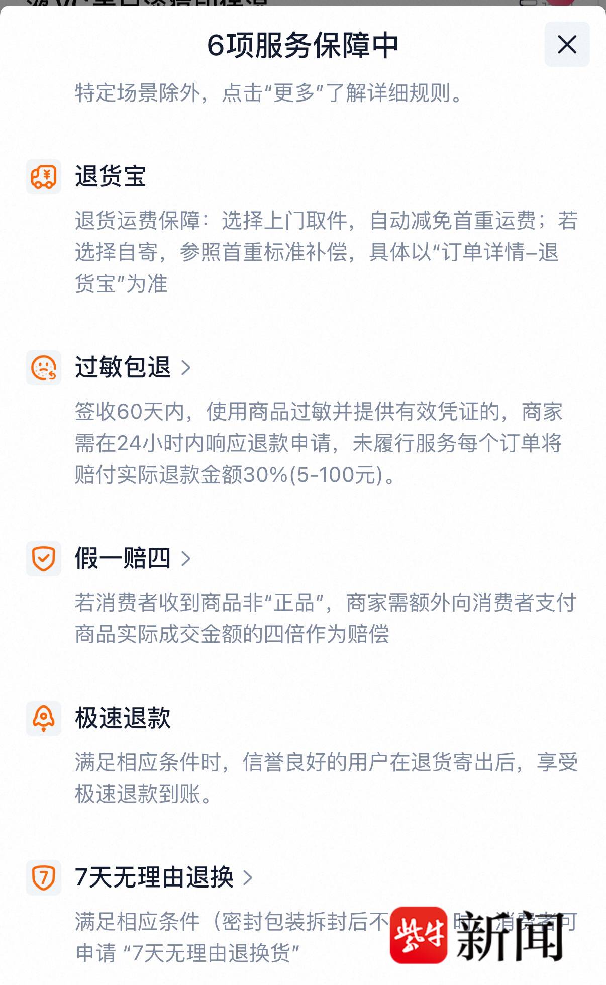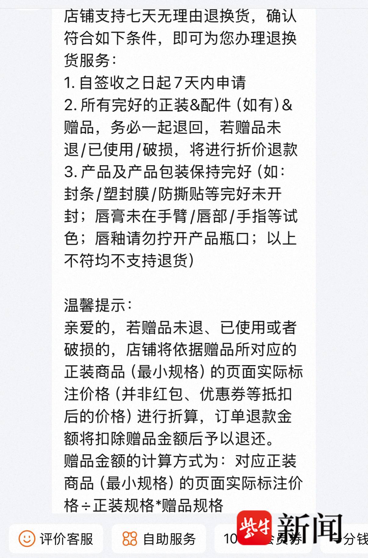 记者在电商平台查看了多家美妆官方旗舰店的精华类商品服务保障,发现多数店铺虽标注“支持7天无理由退换”,但同时也在下方标注了:满足相应条件(密封包装拆封后不支持)时,消费者可申请“7天无理由退换货”。记者随机咨询了一家店铺关于“七天无理由退货”的具体满足条件时,客服给出了更细化的规则,增加了配件及赠品的内容。