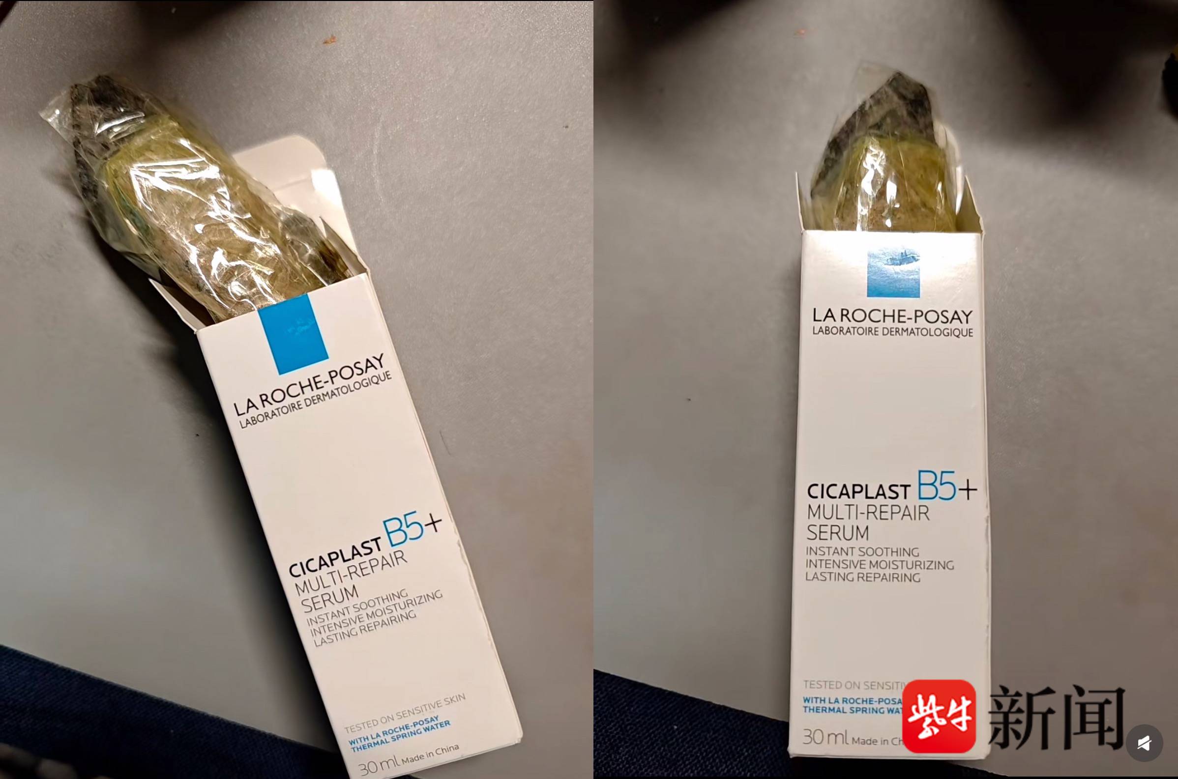 记者联系到发帖人胡女士,她告诉记者,自己是在理肤泉淘宝官方旗舰店下单,“包裹签收的时候是非常正常的,没有任何破损和拆封痕迹,包括打开以后精华的外盒封贴都是较为完好的。”由于双十一网购频繁且此前无类似遭遇,她未录制开箱视频,“拿着的手感和一瓶精华差不多,拆快递时完全没怀疑。”