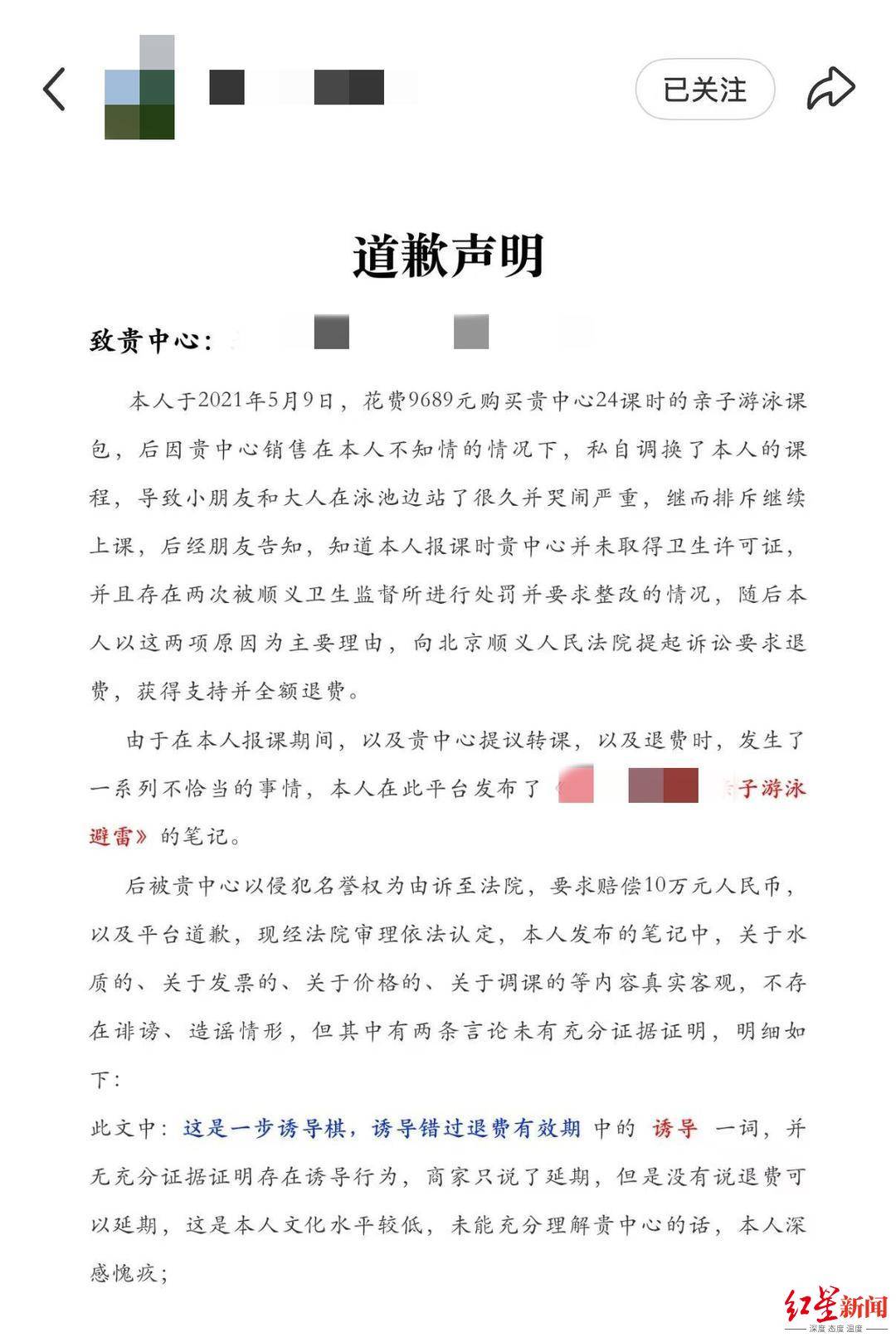 近日,苏女士在小红书等平台发布了这份致歉声明。11月13日,红星新闻记者尝试联系该家游泳培训机构,但是未获得回复。
