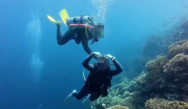 其中,一段时长约44秒的视频显示,一名潜水员正面对镜头摆出“比心”动作,身后有另一名潜水员伸手对其气瓶进行操作。随后,被操作气瓶的潜水员疑似察觉异常,迅速更换至备用二级头。