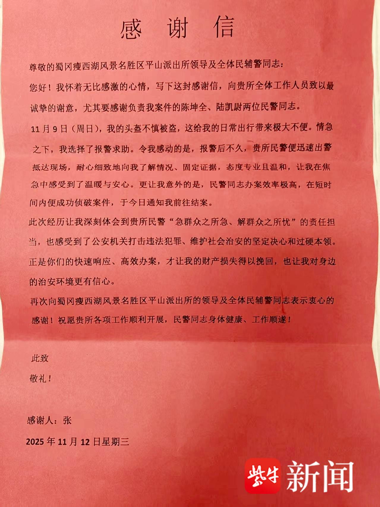 扬子晚报网11月15日讯(通讯员 王正 记者 陈咏)“一个头盔值不了多少钱,但是跟我日常出行的安全息息相关,蛮重要的。没想到这么小的事,民警同志这么上心,这么快就帮我找到了,很感动。”12日,市民张先生将一封黑底红字的感谢信送到扬州景区公安分局平山派出所,向办案民警连连道谢。记者了解到,这温暖的一幕,源于一起看似“不起眼”的电动车头盔被盗案。事虽小,却诠释了民警“小事不小看、小案不小办”的为民初心。
