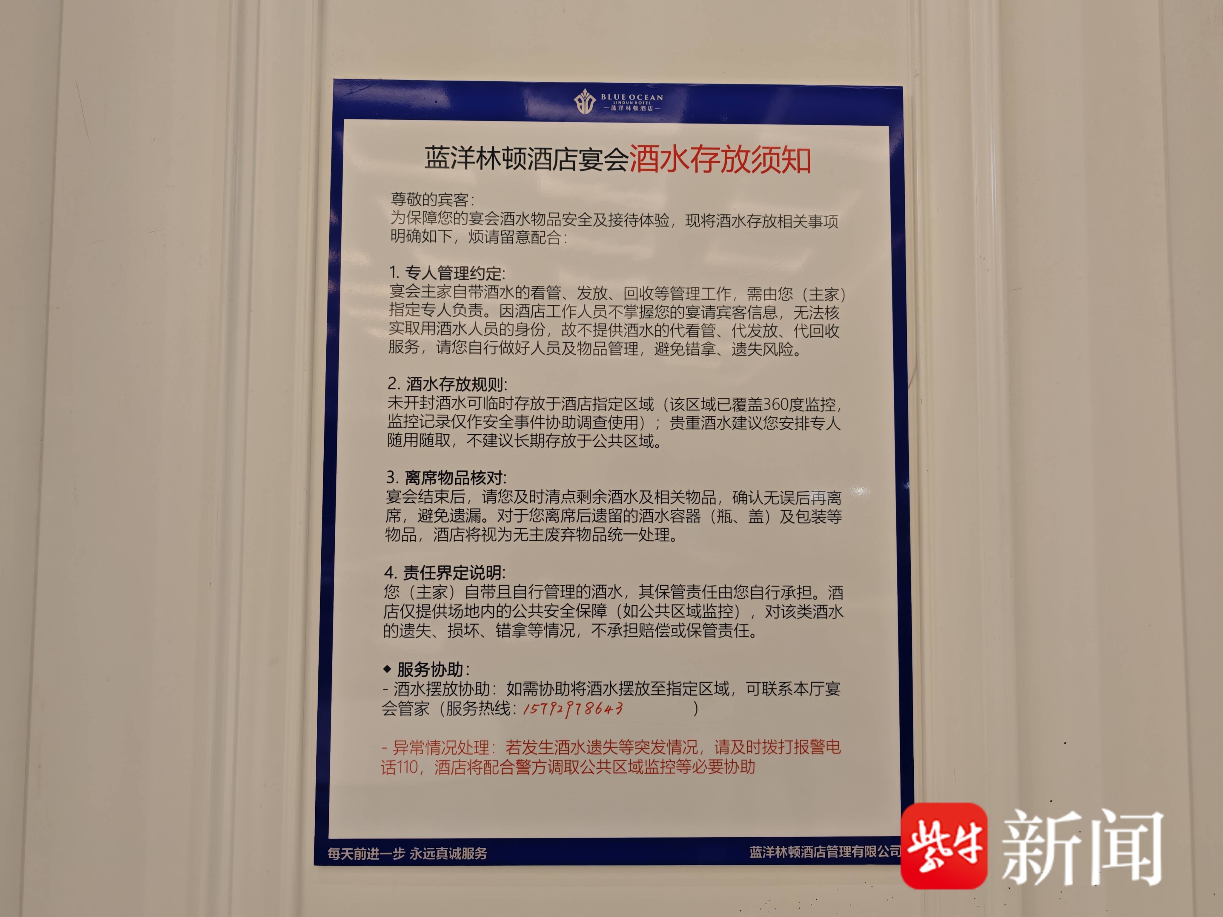 记者在宴会厅看到,《酒水存放须知》被张贴在墙上,明确写道: