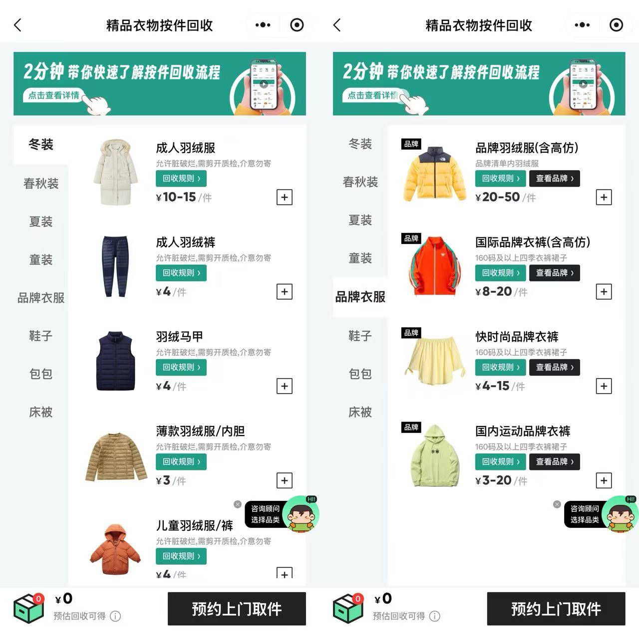 打开“绿衣侠旧衣按件回收”小程序可以看到,平台主要提供按件查价卖和按件省心卖两种回收方式,回收品类涵盖四季衣物、鞋子及品牌衣物等,预估价格从0.1元到几十元不等。随后记者以普通用户身份咨询“绿衣侠”客服了解到:由于“省心卖”邮寄服务在体验上未能达到预期,决定暂停该服务以进行优化。