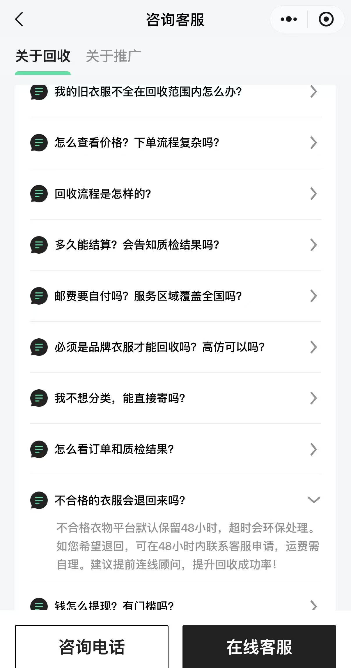 关于“不合格的衣物是否会退回”这一问题,小程序咨询客服页面已明确说明:不合格衣物平台默认保留48小时,超时会环保处理;如希望退回,可在48小时内联系客服申请,运费需自理。