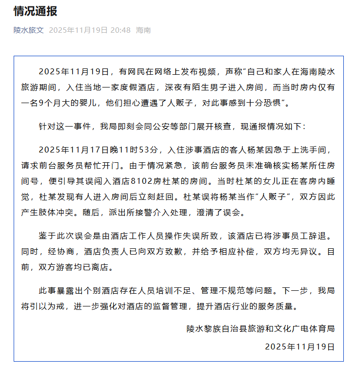 11月19日晚,扬子晚报/紫牛新闻记者注意到,陵水黎族自治县旅游和文化广电体育局发布情况通报:2025年11月19日,有网民在网络上发布视频,声称“自己和家人在海南陵水旅游期间,入住当地一家度假酒店,深夜有陌生男子进入房间,而当时房内仅有一名9个月大的婴儿,他们担心遭遇了人贩子,对此事感到十分恐惧”。针对这一事件,我局即刻会同公安等部门展开核查,现通报情况如下: