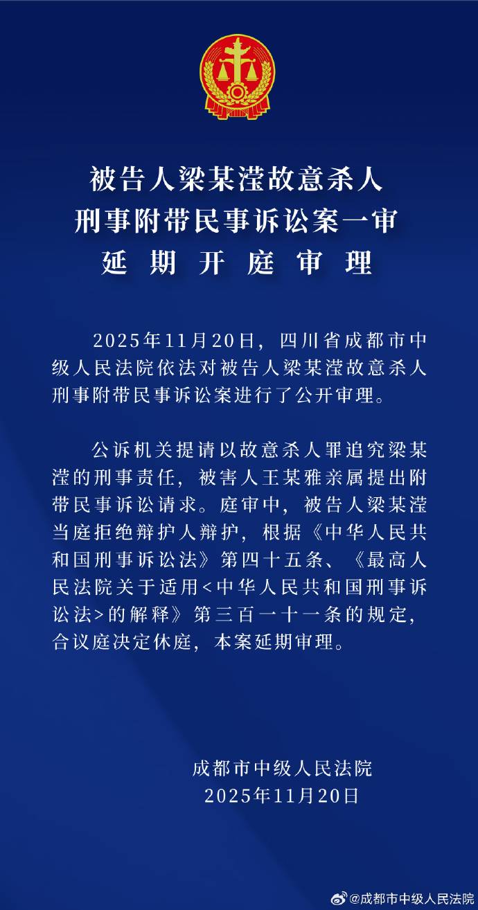 成都女子家门口被害案一审休庭,法院宣布延期审理