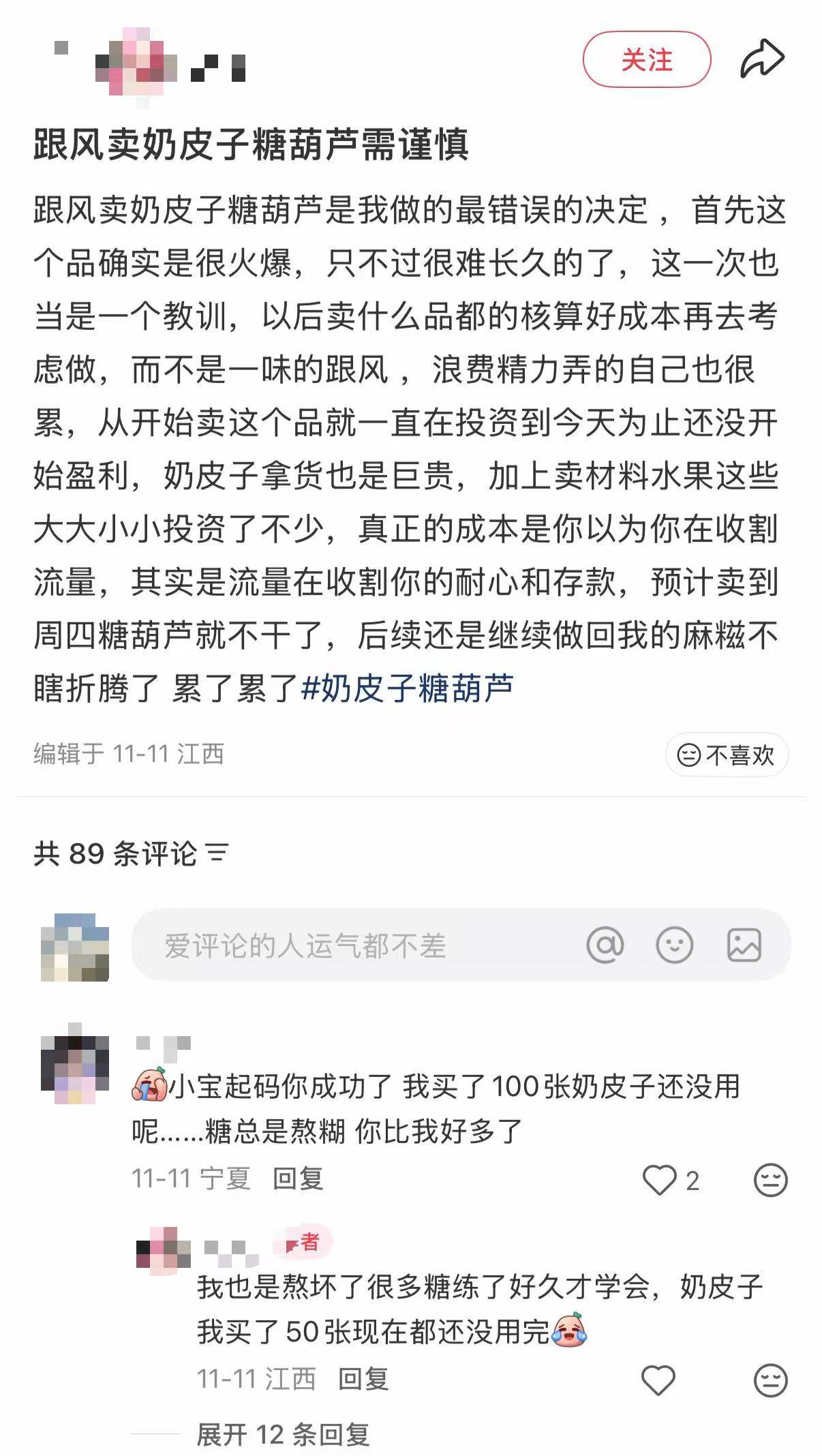 对于热度的降温,商家们的感受比消费者更为直接。社交平台上,不少售卖奶皮子糖葫芦的商家吐槽近期销量不佳,有商家直言“入场晚了,前段时间确实能赚钱,现在没热度了”。记者了解到,这款网红小吃的制作并没有想象中的简单,糖壳裹制、奶皮子保鲜等工艺都有一定门槛,需要一段时间的磨合。有商家透露,“本想趁着热度赚一波,结果还没摸透技巧,市场就冷了”。