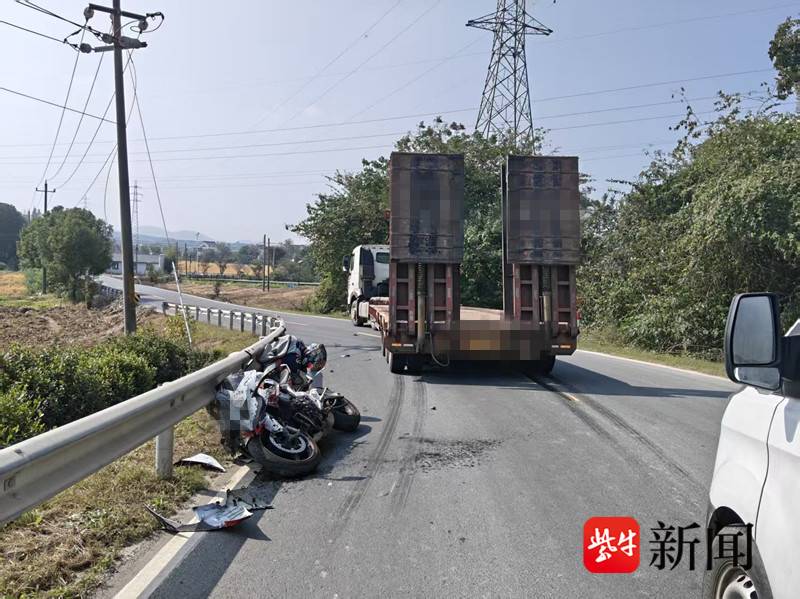 扬子晚报网11月30日讯(记者 郭一鹏 通讯员 尹峥嵘) 近日,南京江宁交警执勤七中队接到报警称,辖区某路段一辆重型半挂货车与一辆普通二轮摩托车发生碰撞。中队民警到达现场后,发现事发生处于一个上下坡弯道处,重型半挂货车车头停在其正常行驶的车道上,车尾留在了对向车道上,车尾后方有辆二轮摩托车,斜靠在路旁护栏上,摩托车驾驶员手指受伤、摩托车车身受损。