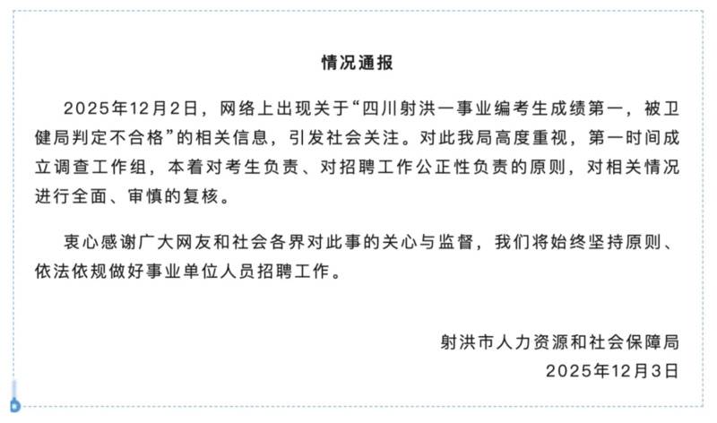 通报称,12月2日,网络上出现关于“四川射洪一事业编考生成绩第一,被卫健局判定不合格”的相关信息,引发社会关注。