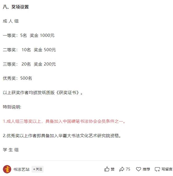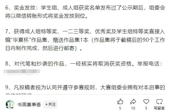 记者梳理了解到,今年8月至10月,“书法艺站”等公众号曾发布该书法大赛的征稿启事。启事中称,大赛组织机构的学术支持单位系中国硬笔书法协会书法教育专业委员会,主办单位为华夏大书法文化艺术研究院,承办单位包括朔州市考级基地和开封八古书画院有限公司,落款为“华夏大书法文化艺术研究院”,大赛组委会主任为袁某某。值得注意的是,启事中标注称“对代笔和抄袭的作品,一经核实将取消获奖资格”,还写有一个“举报电话”。