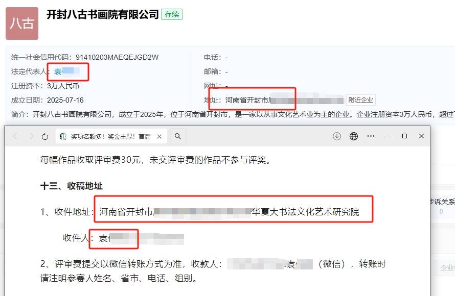 据天眼查App,大赛承办单位“开封八古书画院有限公司”的地址,与赛事稿件收件地址一致,法定代表人系上述袁某某,未登记联系方式。一家名为“华夏大书法(厦门)文化艺术研究院(有限合伙)”的公司的执行事务合伙人袁某某,与上述大赛负责人同名,今年10月,这家艺术研究院已因“通过登记的住所或者经营场所无法联系”被列入经营异常名录。