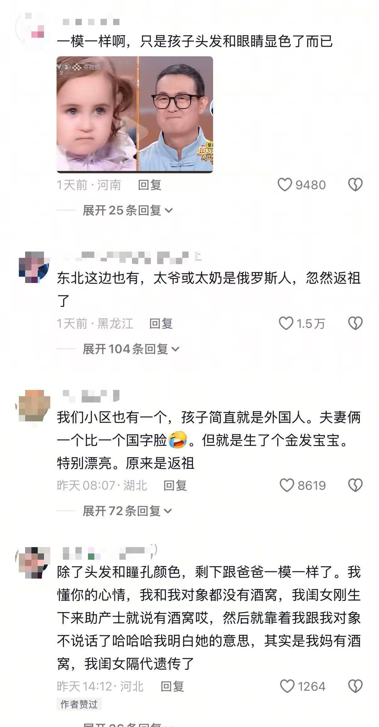 网友们在热议这桩“基因奇迹”的同时,也有细心的网友对比照片后在评论区留言:一模一样啊,只是孩子头发和眼睛显色了而已。还有不少网友主动分享了身边的相似见闻。