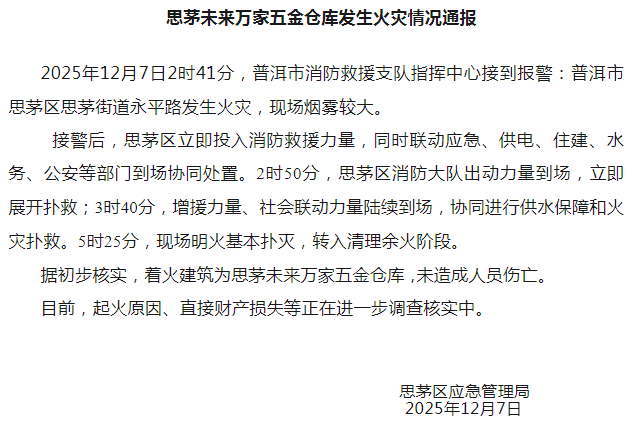 记者注意到,今天(7日)上午, 思茅区应急管理局针对此事发布了情况通报。通报称,2025年12月7日2时41分,普洱市消防救援支队指挥中心接到报警:普洱市思茅区思茅街道永平路发生火灾,现场烟雾较大。接警后,思茅区立即投入消防救援力量,同时联动应急、供电、住建、水务、公安等部门到场协同处置。2时50分,思茅区消防大队出动力量到场,立即展开扑救;3时40分,增援力量、社会联动力量陆续到场,协同进行供水保障和火灾扑救。5时25分,现场明火基本扑灭,转入清理余火阶段。