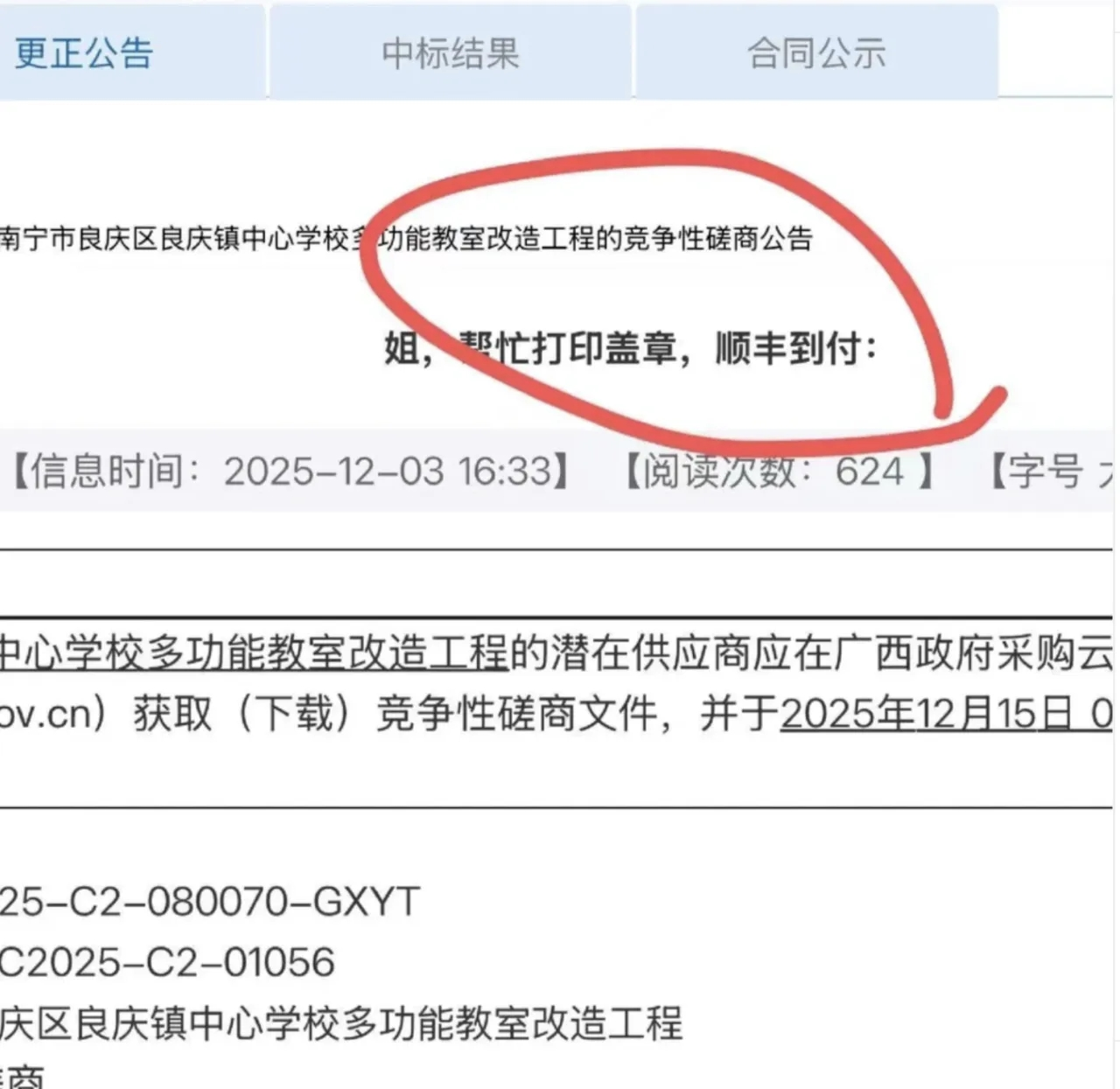 近日,有人反映南宁市良庆区良庆镇中心学校多功能教室改造采购项目在招标中,把公告标题写成“姐,帮忙打印盖章,顺丰到付”,随后又在半小时后发布更正公告。在接受记者采访时,项目采购单位南宁市良庆区教育局工作人员表示,事情正在核实中。而涉事的采购代理机构广西云泰项目管理有限公司未对此予以正面回应。