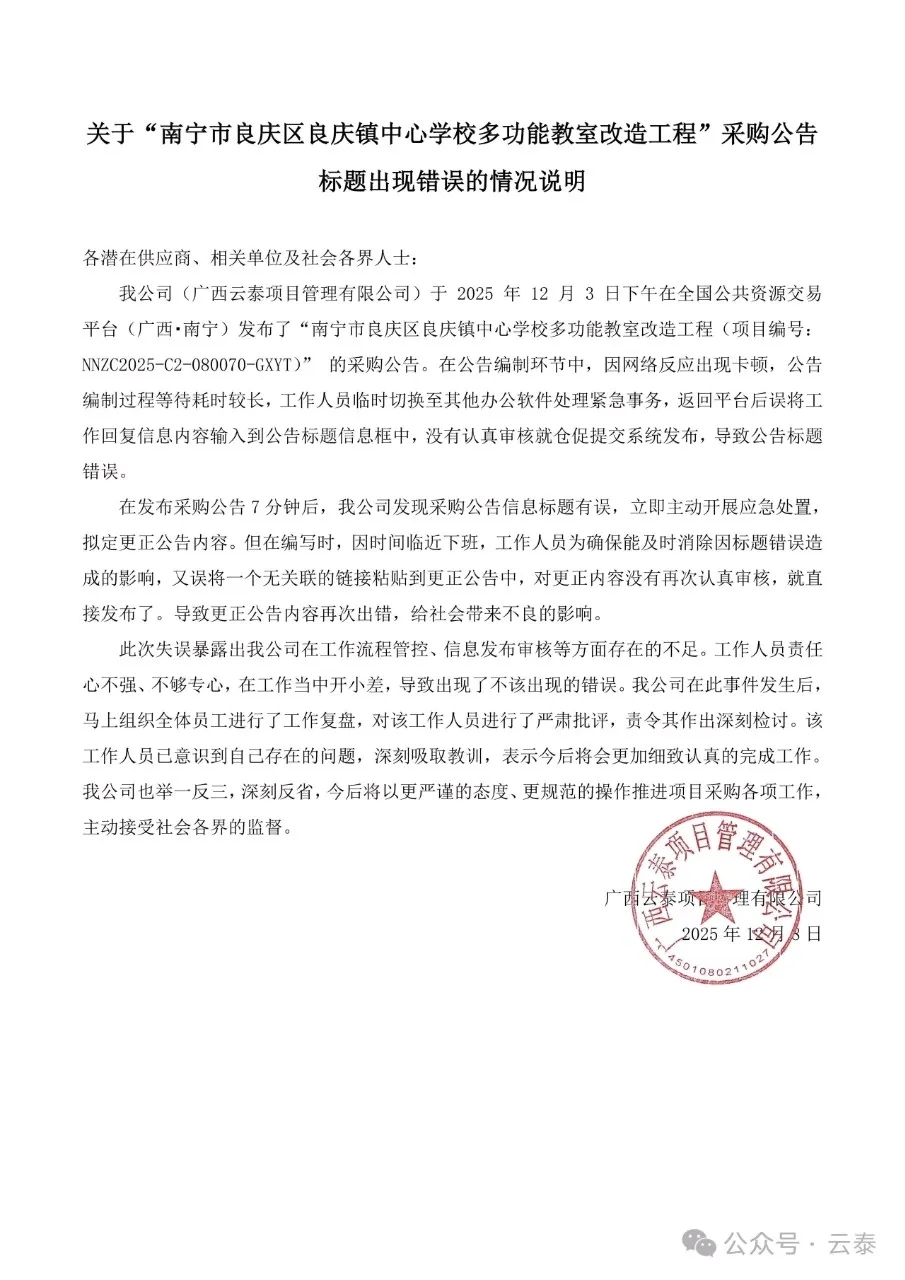 记者注意到,就在12月8日晚,南宁市良庆区教育局转发了广西云泰项目管理有限公司对此最新情况说明。该说明中称,广西云泰项目管理有限公司于2025年12月3日下午在全国公共资源交易平台(广西•南宁)发布了“南宁市良庆区良庆镇中心学校多功能教室改造工程(项目编号: NNZC2025-C2-080070-GXYT)”的采购公告。在公告编制环节中,因网络反应出现卡顿,公告编制过程等待耗时较长,工作人员临时切换至其他办公软件处理紧急事务,返回平台后误将工作回复信息内容输入到公告标题信息框中,没有认真审核就仓促提交系统发布,导致公告标题错误。