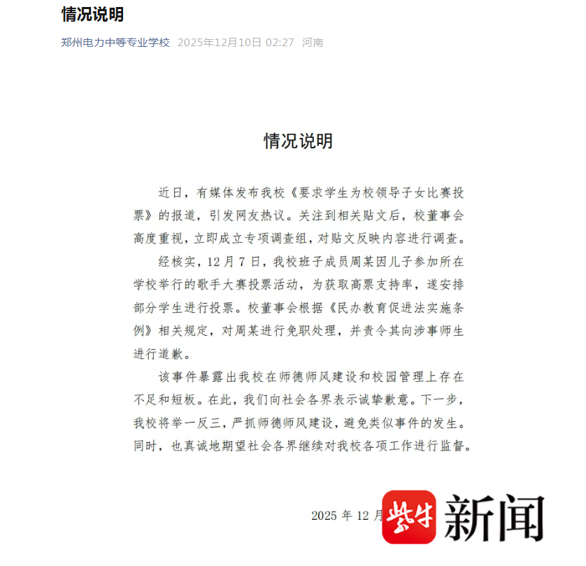 记者注意到,今天(10日)凌晨,郑州电力中等专业学校就此发布了情况通报。通报称,近日,有媒体发布我校《要求学生为校领导子女比赛投票》的报道,引发网友热议。关注到相关贴文后,校董事会高度重视,立即成立专项调查组,对贴文反映内容进行调查。经核实,12月7日,我校班子成员周某因儿子参加所在学校举行的歌手大赛投票活动,为获取高票支持率,遂安排部分学生进行投票。校董事会根据《民办教育促进法实施条例》相关规定,对周某进行免职处理,并责令其向涉事师生进行道歉。