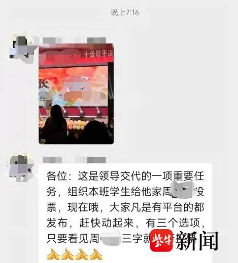 扬子晚报网12月10日讯(记者 郭一鹏) 近日,有网友在社交平台发文称,郑州某学校一微信群内,校领导布置“重要任务”,要求学生给参加歌手大赛的领导孩子投票。